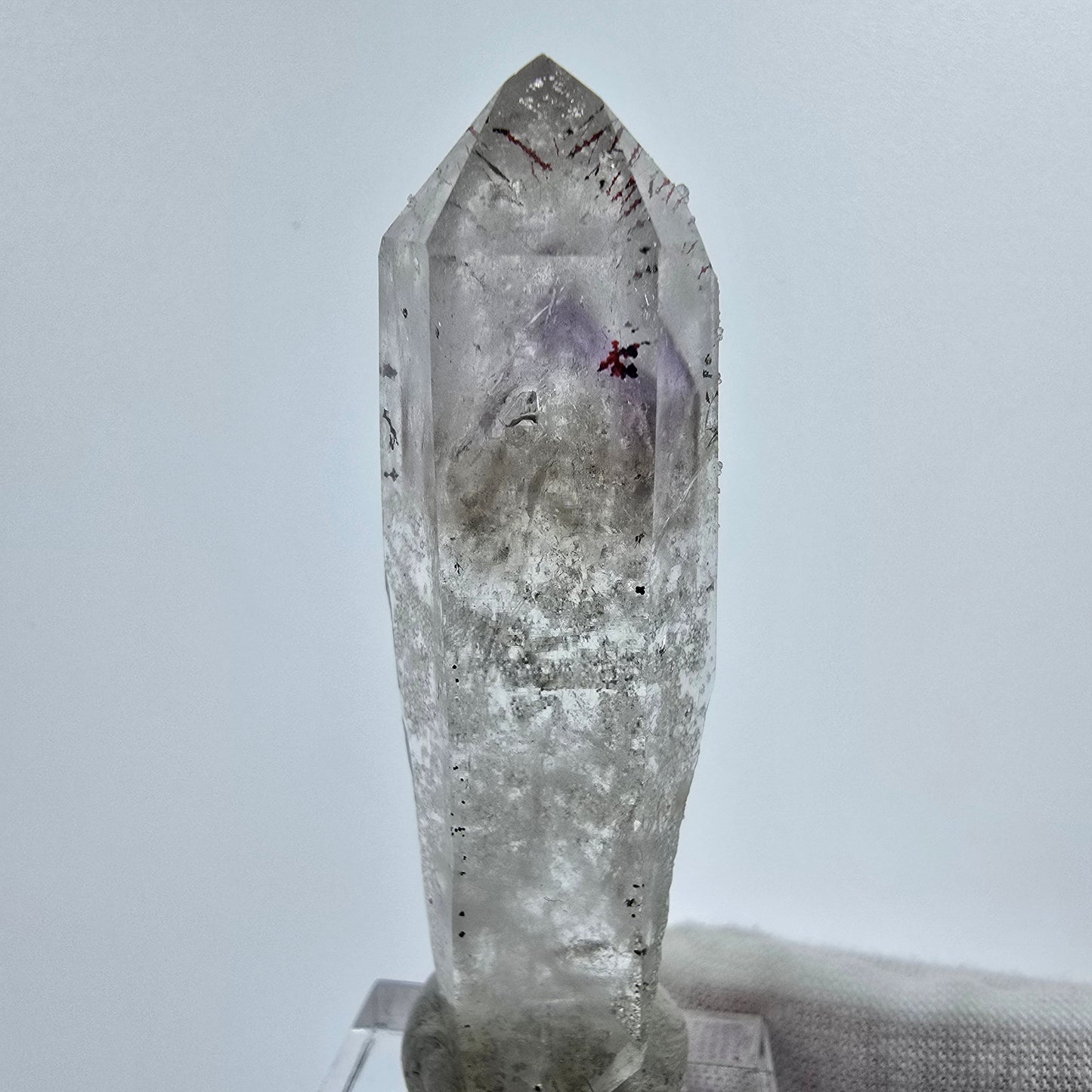 Entdecken Sie dieses seltene Stück: Eine klare Harlekin Amethyst Kristallspitze mit einer lila-weiß-transparenten Kristallspitze, die wunderbare Phantome im Inneren aufweist. In dessen Inneren findet man zudem sehr seltene rot und schwarz glänzende Hämatit-Einschlüsse (Harlekin Quarz), die dem Kristall einen einzigartigen Charakter verleihen. An einer Seite sind auch viele weiß-transparente Analcim Kristalle gewachsen, die die Schönheit und Seltenheit dieses faszinierenden Objekts noch unterstreichen.