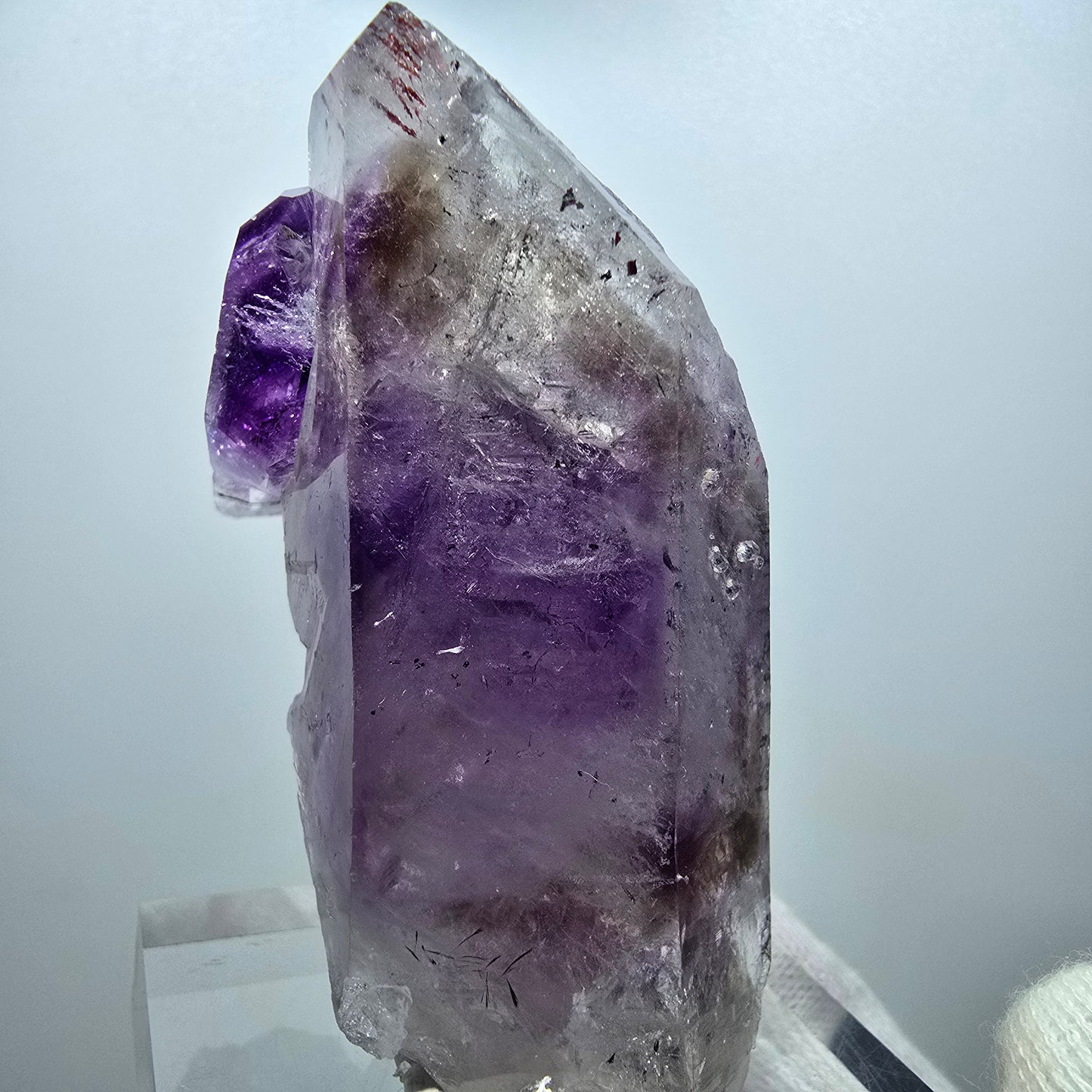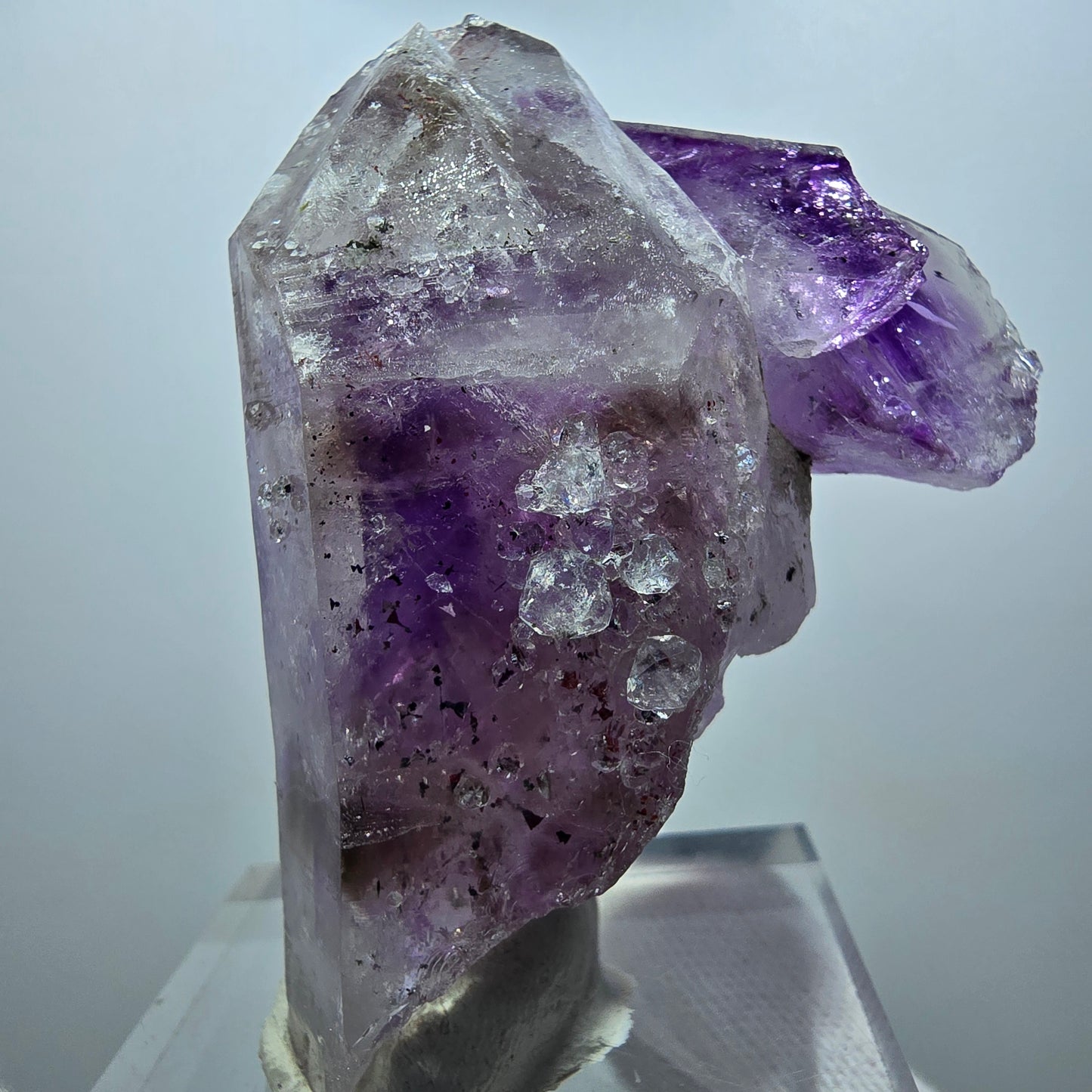 Dieser seltene und außergewöhnliche Harlekin Phantom Amethyst zeichnet sich durch klare, zusammengewachsene Kristallspitzen aus. Die charakteristischen lila, weißen und braunen Farben sowie die transparenten, phantomhafte Erscheinung verleihen dem Kristall einen einzigartigen Reiz. Im Inneren befinden sich atemberaubende lila-braune Phantome, die das faszinierende Design des Phantomquarzes auszeichnen.