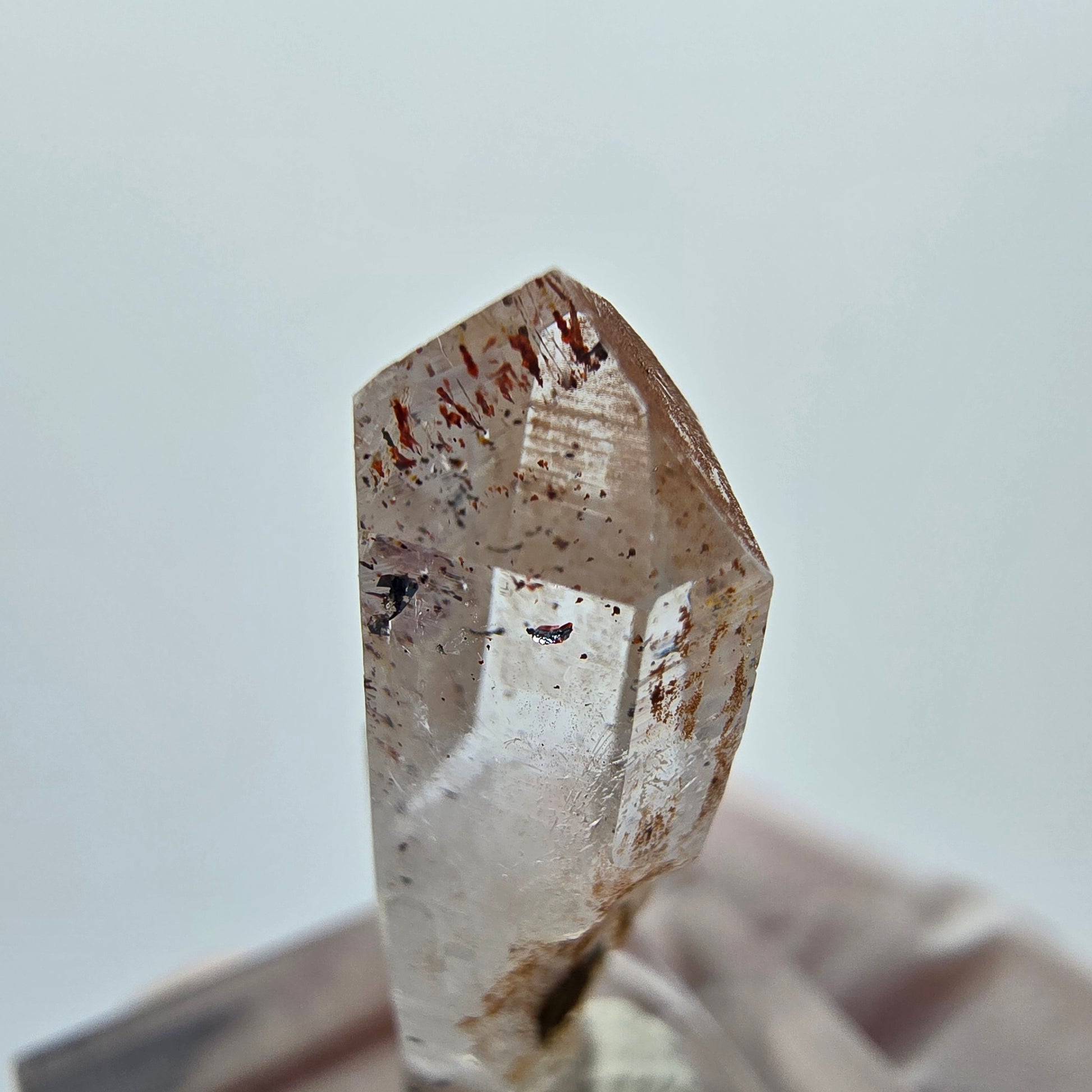 - Besonderheiten: Klare, transparente Kristallspitze mit Phantomen, roten Hämatit-Einschlüssen und Lemurian-Querrillen
