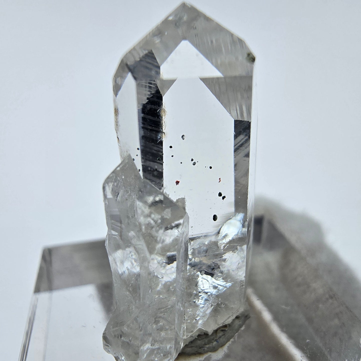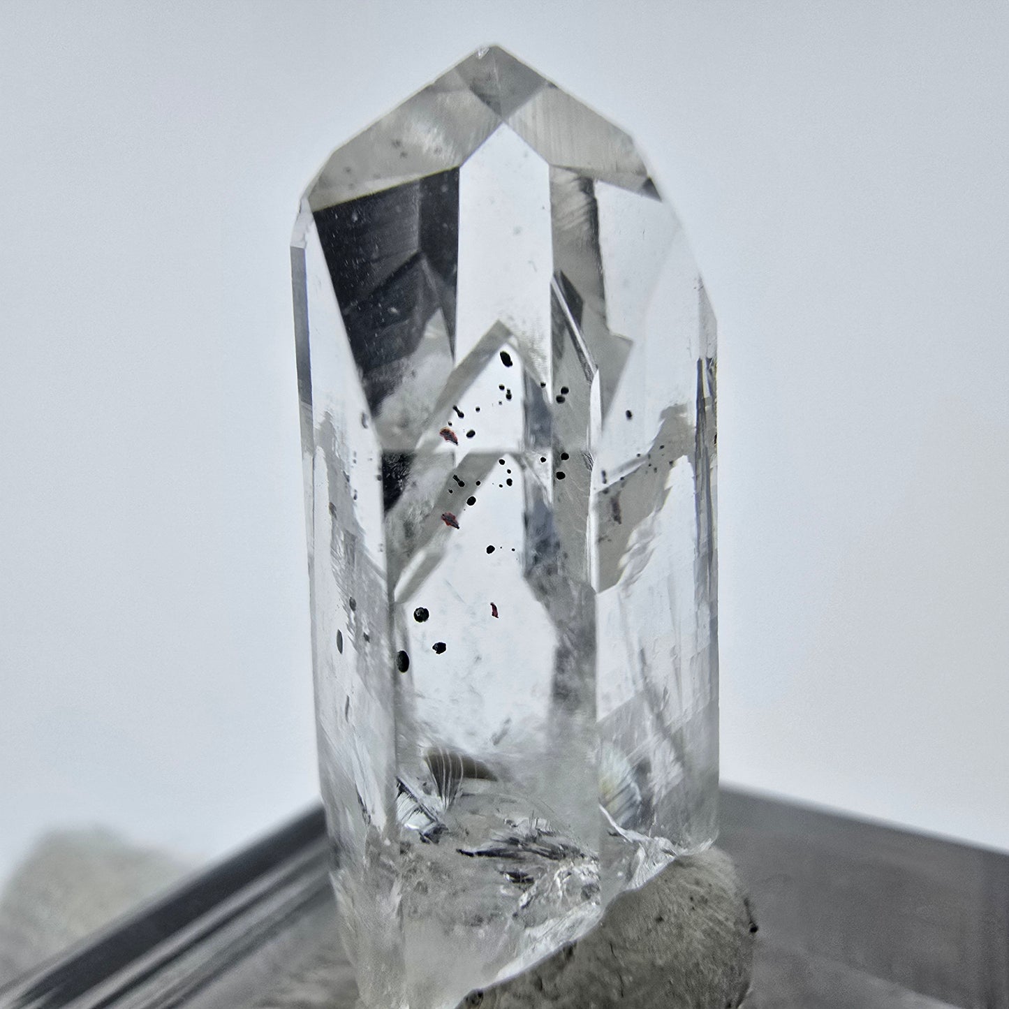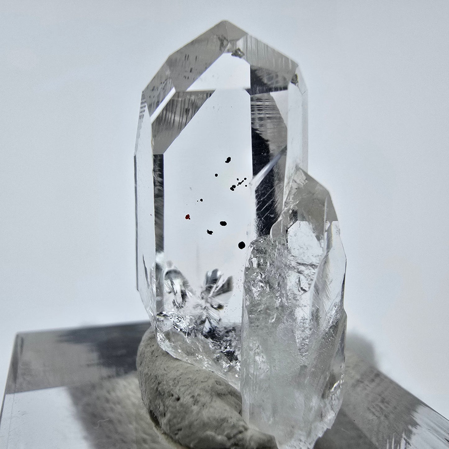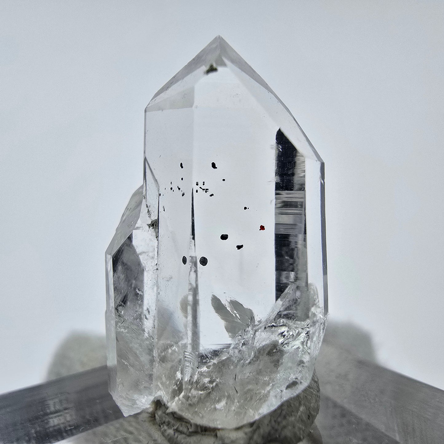 - Farbe: Klar, weiß transparent mit schwarzen Hämatit Einschlüssen