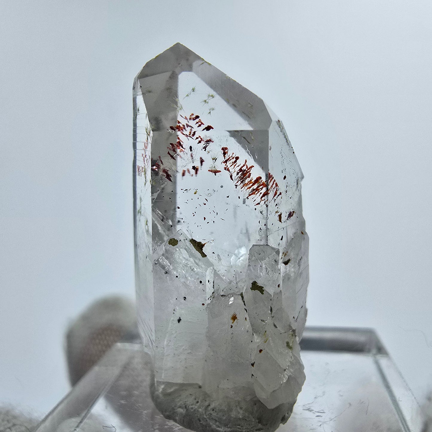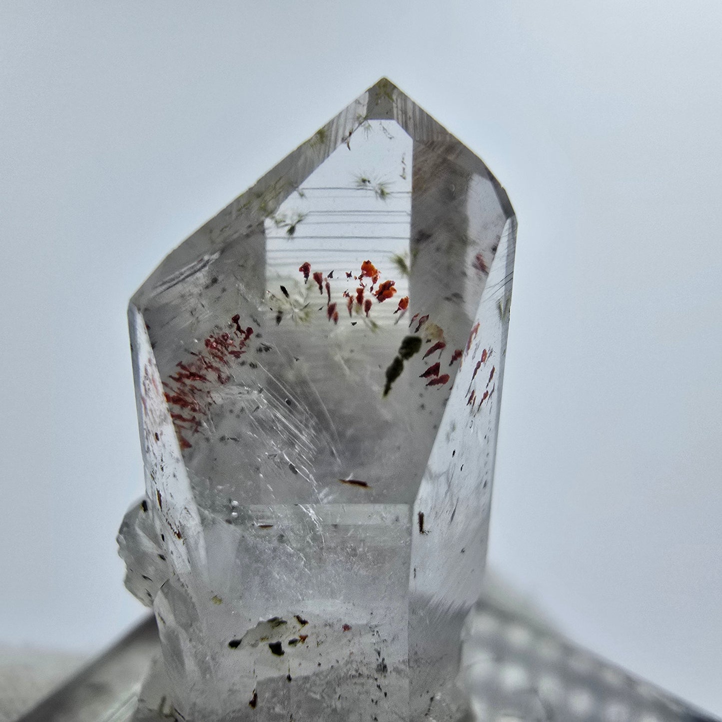 Entdecken Sie unseren seltenen Harlekin Quarz Kristall, der in der Streep Mine in Goboboseb, Namibia, gewonnen wurde. Dieser wunderschöne Kristall zeichnet sich durch seine klare, transparente Spitze aus, die in Kombination mit feinen grauen Phantomen im Inneren beeindruckt. Die auffälligen rot und schwarz glänzenden Hämatit-Einschlüsse machen diesen Kristall zu einem absoluten Highlight für Sammler und Liebhaber.