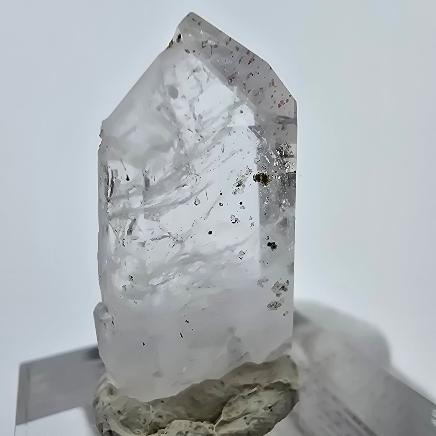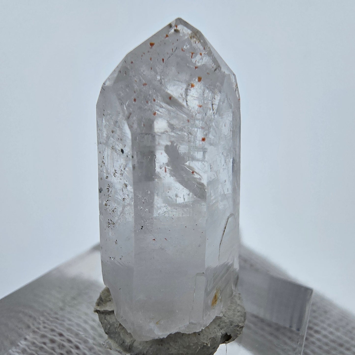 - Besonderheiten: Klare weiße Transparenz, seltene Hämatit Einschlüsse, Phantome im Inneren