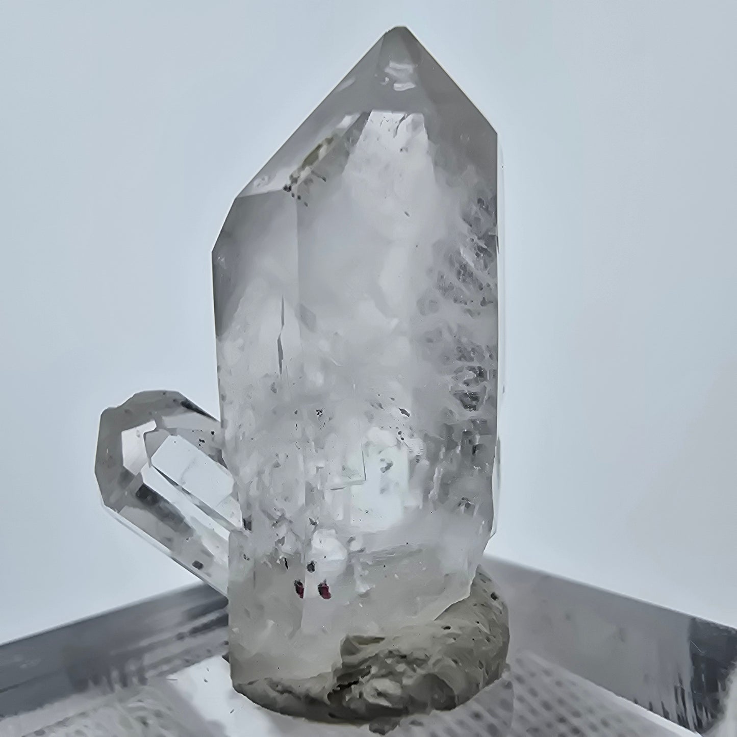 Entdecken Sie diesen seltenen klaren, weiß-transparenten Quarz Kristall, der mit einzigartigen schwarzen und roten nadelförmigen Hämatit Einschlüssen versehen ist. Besondere Merkmale dieses Kristalls sind die faszinierenden Phantome, die ihm eine mystische Ausstrahlung verleihen. Jeder Fund ist ein Unikat und erzählt seine eigene Geschichte von der Streep Mine in Goboboseb, Namibia.