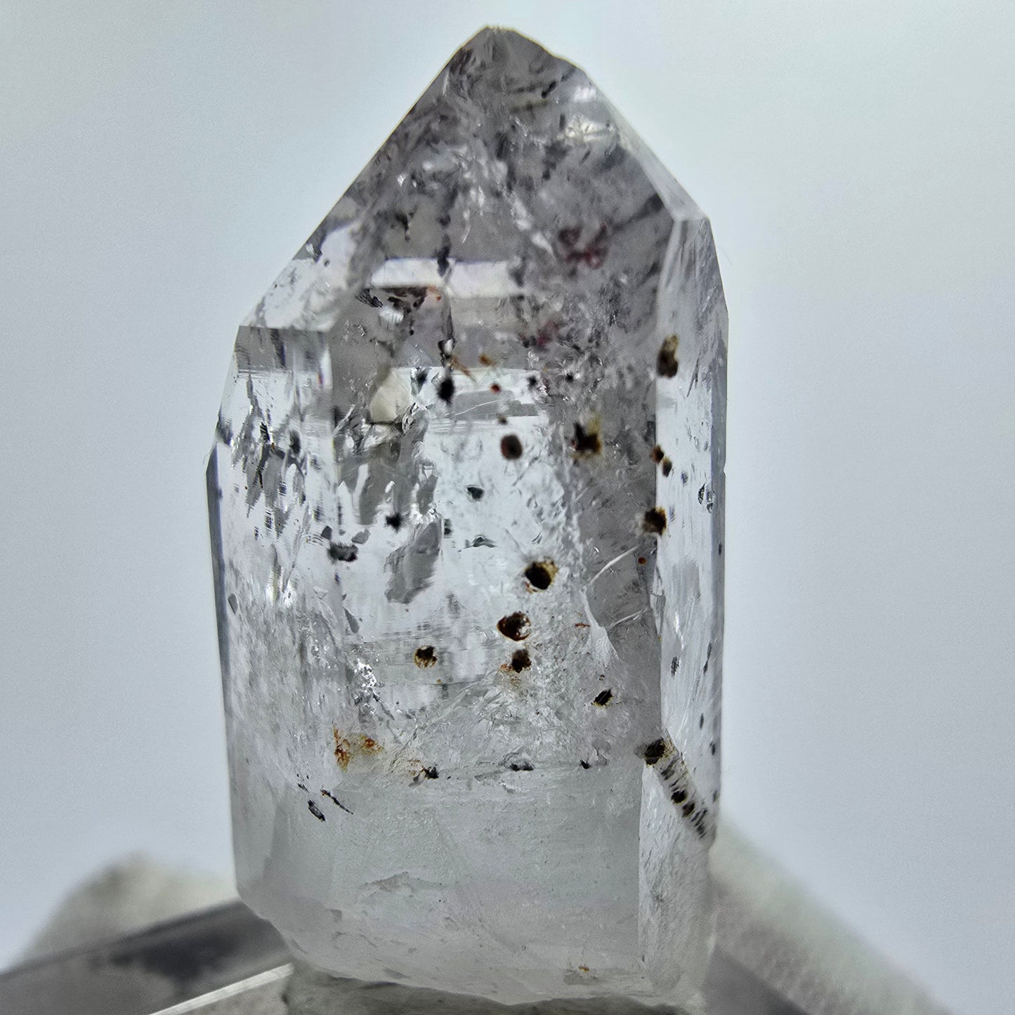 Entdecken Sie die Schönheit und Seltenheit des Harlekin Phantom Quarz Kristalls. Diese beeindruckende, klare Kristallspitze stammt aus der Streep Mine in Goboboseb, Namibia. Mit einer majestätischen weiß-transparenten Spitze und faszinierenden grauen Phantomen im Inneren zieht dieser Kristall alle Blicke auf sich.