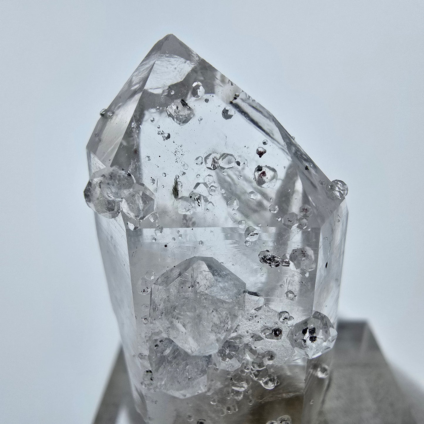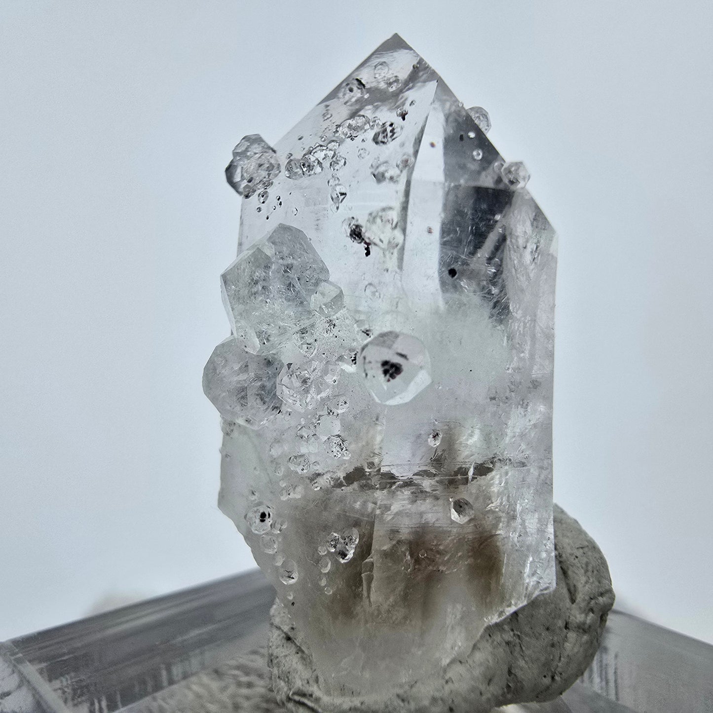 Entdecken Sie diesen seltenen klaren, weiß-transparenten Quarz Kristall, der mit einzigartigen, nadelförmigen verwobenen Einschlüssen aus schwarzem und rotem Hämatit verziert ist. Faszinierende Phantome sind im Inneren des Kristalls zu bewundern und verleihen ihm eine besondere Ausstrahlung. An einer Seite wurden kleine, weiß-transparente Analcim Kristalle gebildet, die die Gesamtkomposition harmonisch abrunden.