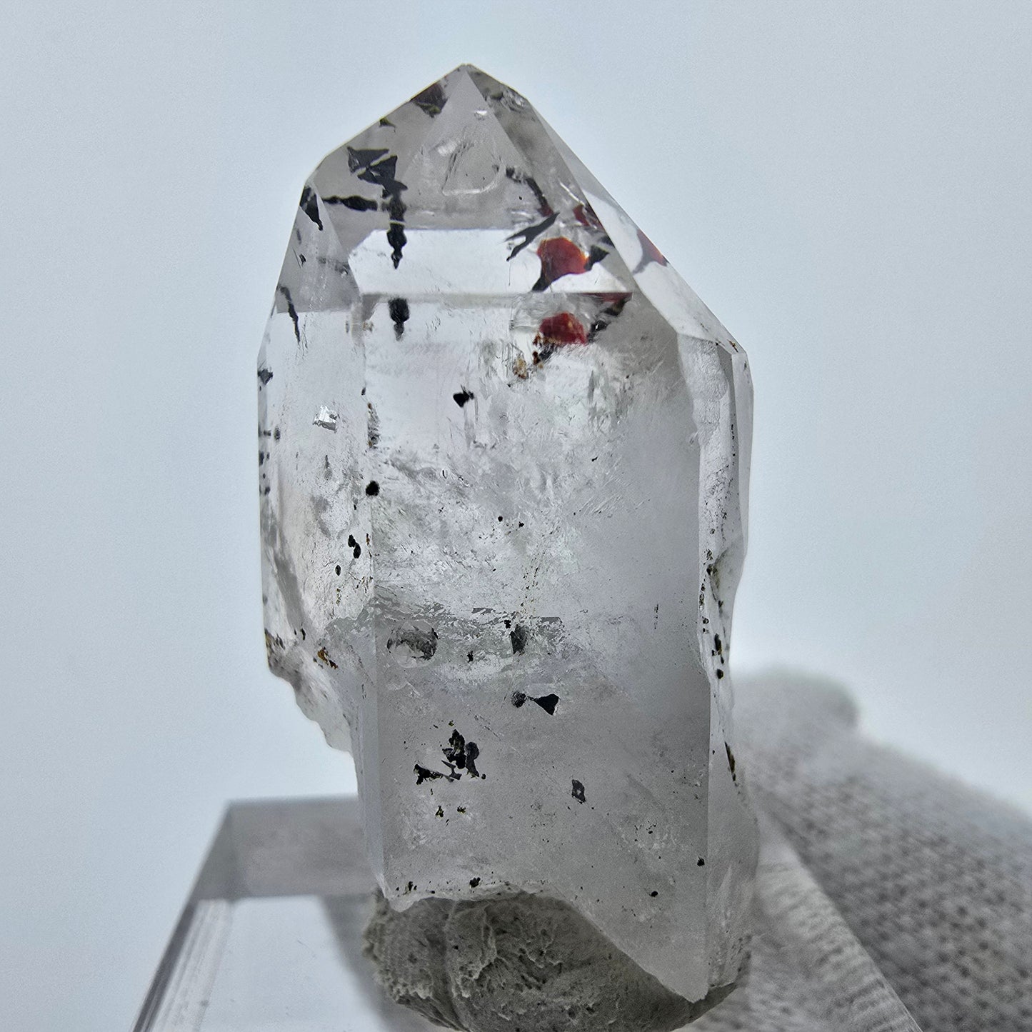 Entdecken Sie den faszinierenden Harlekin Phantom Quarz, einen besonders seltenen klaren, weiß transparenten Quarz Kristall. Dieses einzigartige Stück besticht durch auffällige nadelförmige Hämatit Einschlüssen in den seltenen Farben Schwarz und Rot. Zudem sind wunderschöne Phantome im kristallinen Inneren zu bewundern, die dem Kristall eine mystische Ausstrahlung verleihen. An einer Seite sind kleine, weiß transparente Analcim Kristalle gewachsen, die diesen Quarz weiter veredeln und seine Schönheit unterstreichen.