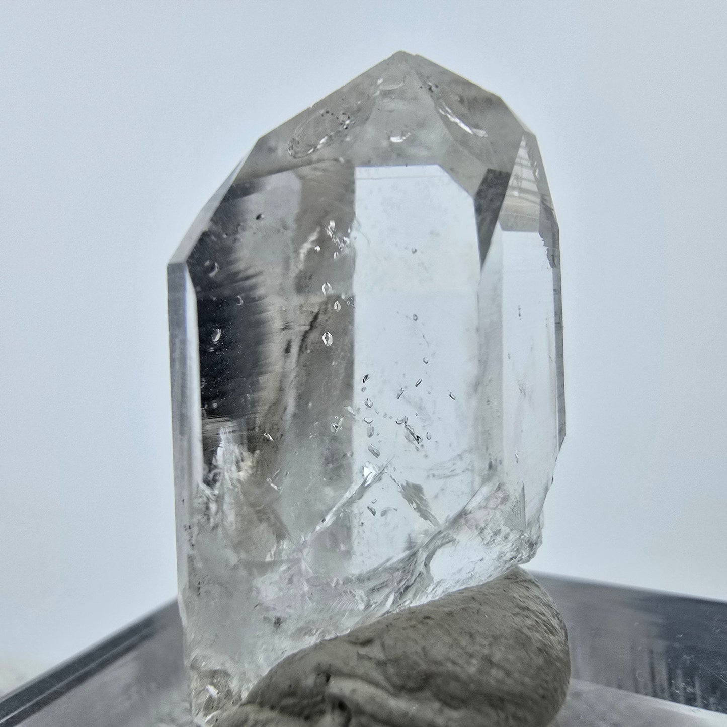 Entdecken Sie unsere seltene klare Weiß transparente Quarz Kristallspitze, ein wahres Sammlerstück mit einzigartigen Eigenschaften. Dieser Lemurian Quarz zeigt wunderschöne Phantomstrukturen im Inneren, die sein außergewöhnliches Wesen unterstreichen. Die horizontal gewachsenen Querrillen an der Oberfläche geben dem Kristall zusätzlich eine unverwechselbare Textur und sorgen dafür, dass er nicht nur energetisch, sondern auch optisch ein Highlight ist.