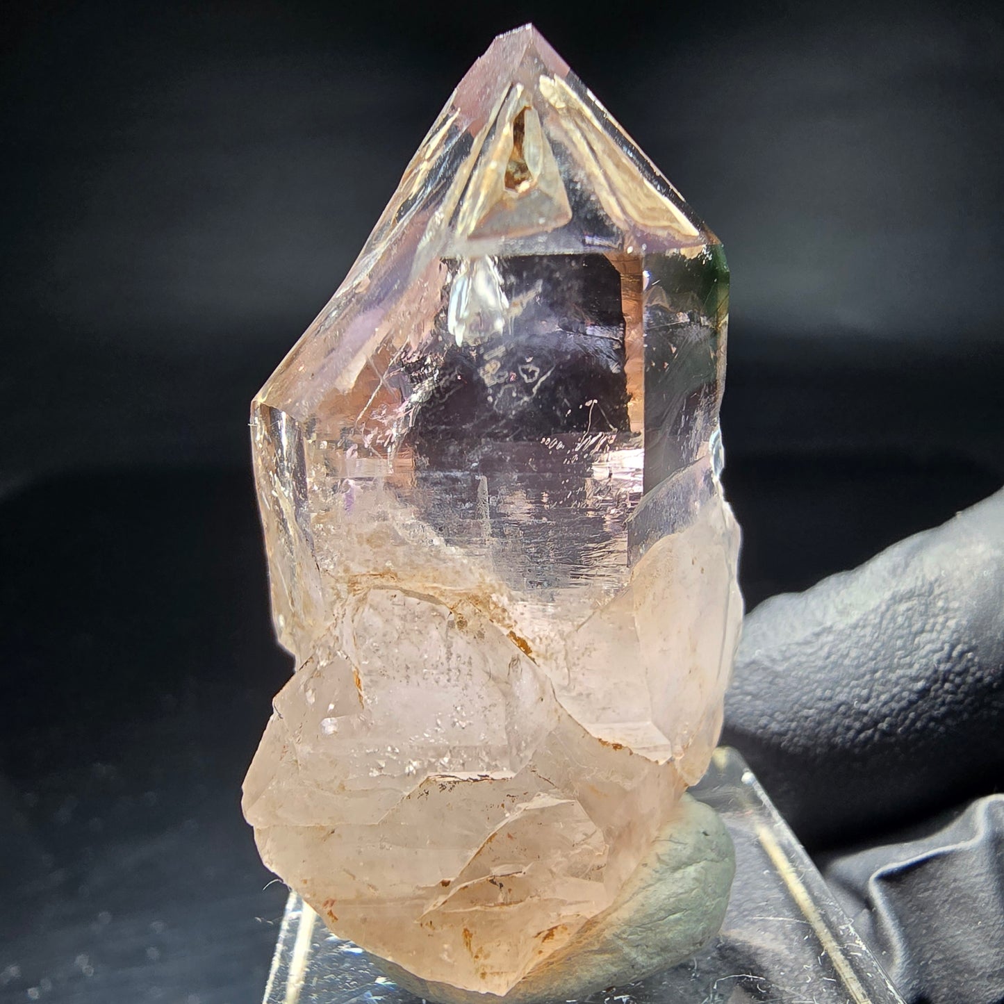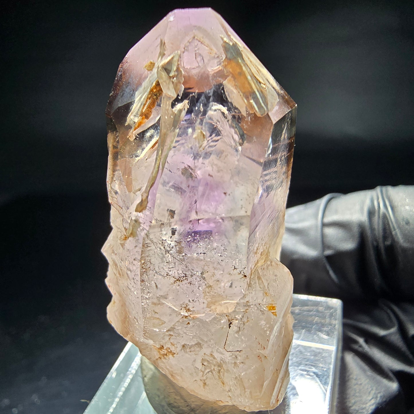 Entdecken Sie die Schönheit und Seltenheit dieser klaren Phantom Amethyst Fenster Zepter Spitze. Dieser außergewöhnliche Kristall besticht durch seine faszinierende lila-braune Transparenz und die einzigartige zepterförmige Kristallform. Die wunderschönen fensterförmigen Einschlüsse verleihen diesem Amethyst eine besondere Tiefe und Charakter, die ihn zu einem wahren Sammlerstück machen.