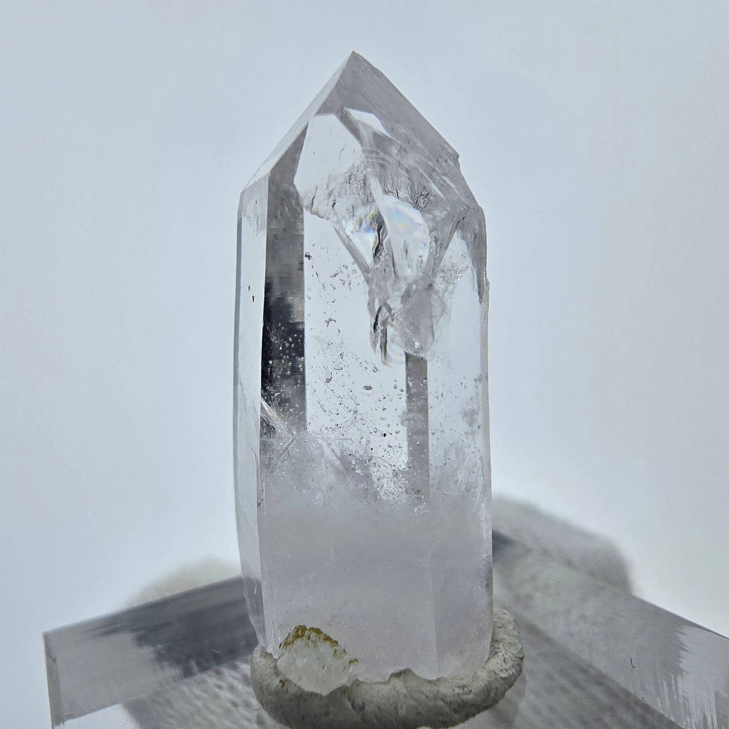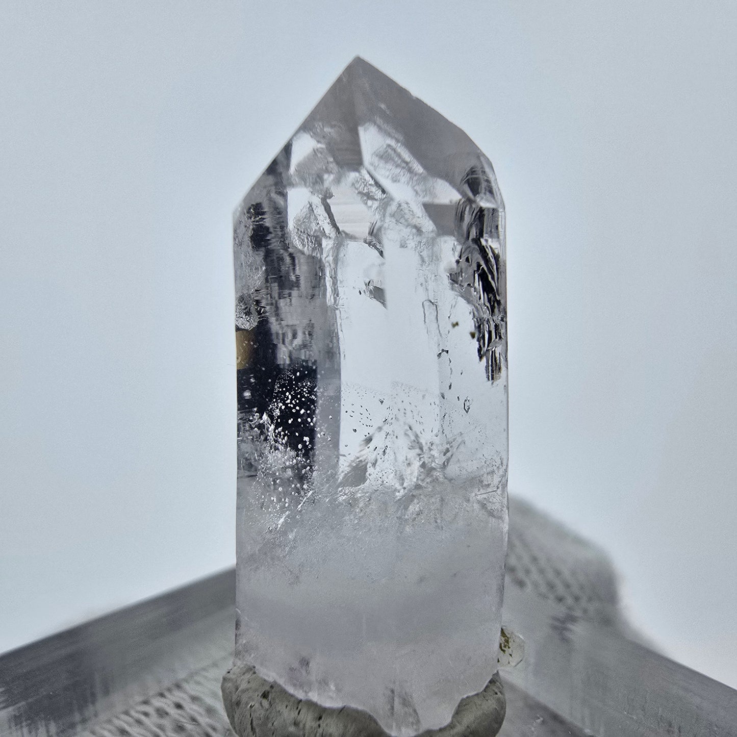 Entdecken Sie die seltene klare lila und weiß transparente Amethyst Kristallspitze, die aufgrund ihrer einzigartigen Struktur und den bezaubernden Phantomen im Inneren begeistert. Diese exquisite Kristallspitze misst 28 x 13 x 10 mm und wiegt 6 g, was sie zu einem perfekten Sammlerstück oder Geschenk für Mineralienliebhaber macht. Gefunden wurde dieser wunderschöne Amethyst in der Streep Mine, gelegen in Goboboseb, Namibia, was ihm eine besondere Herkunft verleiht.