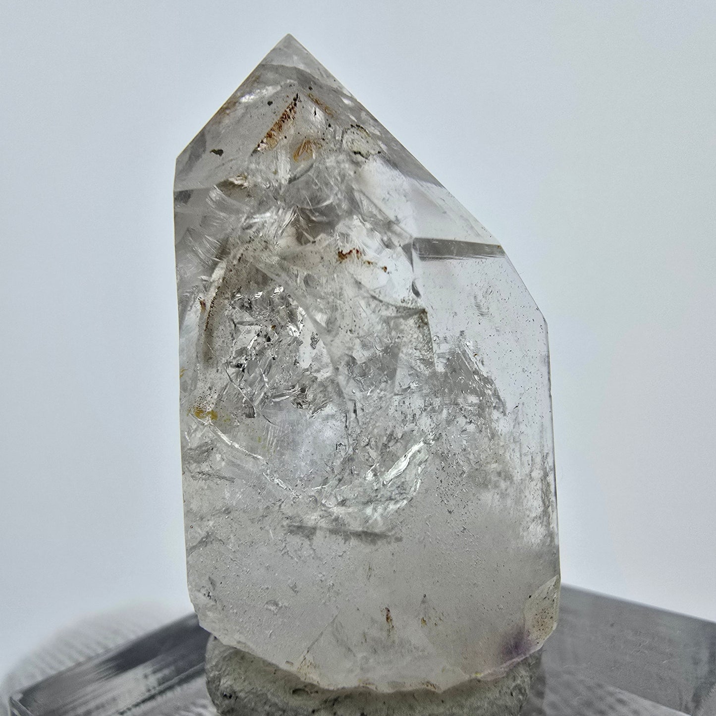 Entdecken Sie die Schönheit dieser seltenen klaren lila, weiß-braun-transparenten Amethyst Kristallspitze mit faszinierenden Phantomen im Inneren. Dieses einzigartige Stück stammt aus der Streep Mine in Goboboseb, Namibia, und bietet eine wunderbare Kombination aus klaren und einzelnartigen Farben, die es zu einem Blickfang in jeder Sammlung machen.