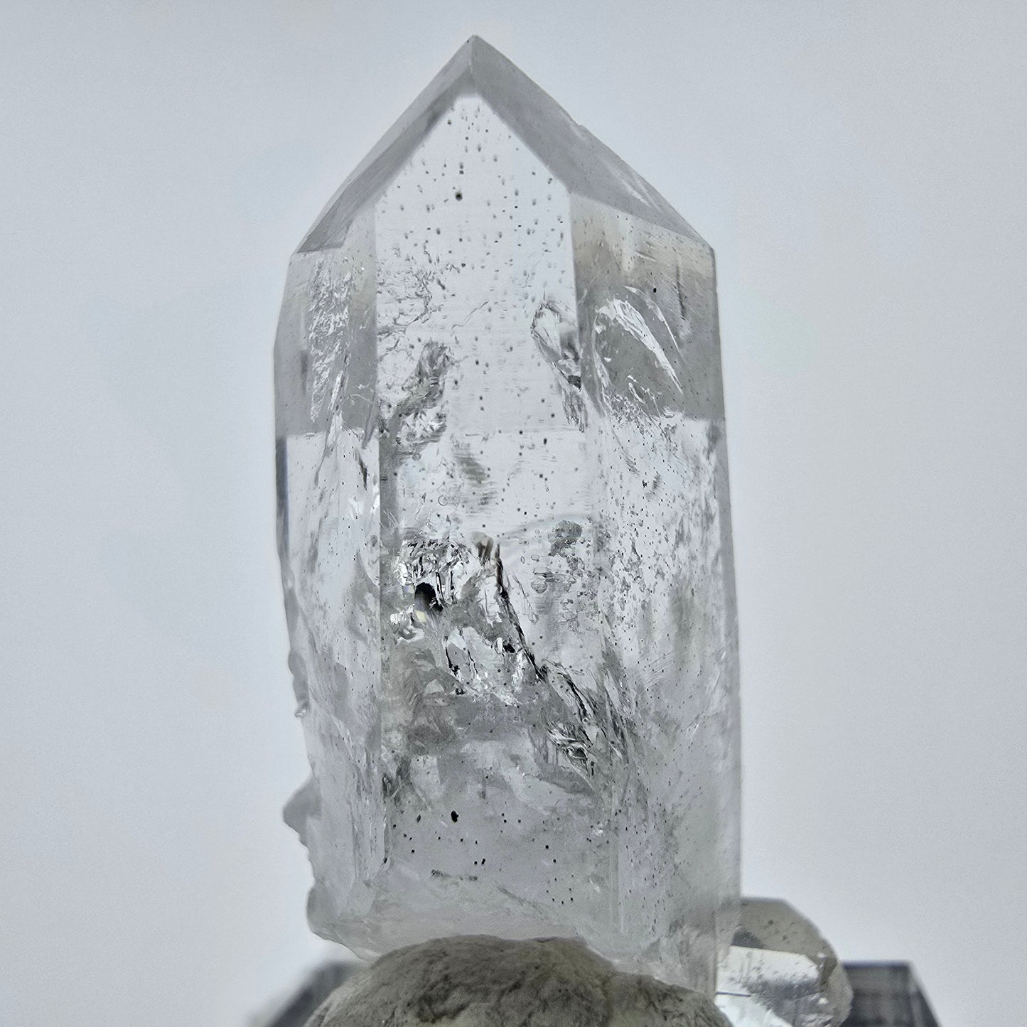 Entdecken Sie diese seltene klare weiß transparente Quarz Kristallspitze, die durch faszinierende Phantome im Inneren besticht. Diese einzigartige Spitze aus hochwertigem Quarz wurde in der Streep Mine in Goboboseb, Namibia, gefunden und hat eine exquisite Erscheinung, die sowohl Sammler als auch Liebhaber ansprechen wird.