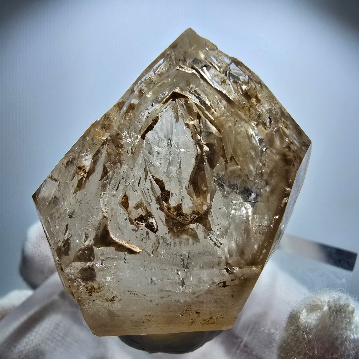 Entdecken Sie diese seltene klare Rauchquarz Kristallspitze, die mit einer einzigartigen braun-weißen und transparenten Kristallbildung verzaubert. Ihr Innenleben birgt wunderschöne Phantome, die dem Objekt eine außergewöhnliche Tiefe verleihen. Die Zepter-Kristallform (Zepter Quarz) macht diese Spitze zu einem faszinierenden Sammlerstück.