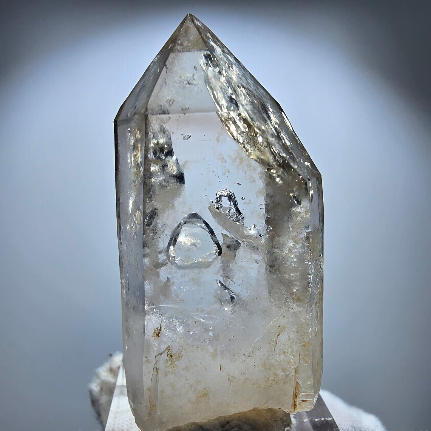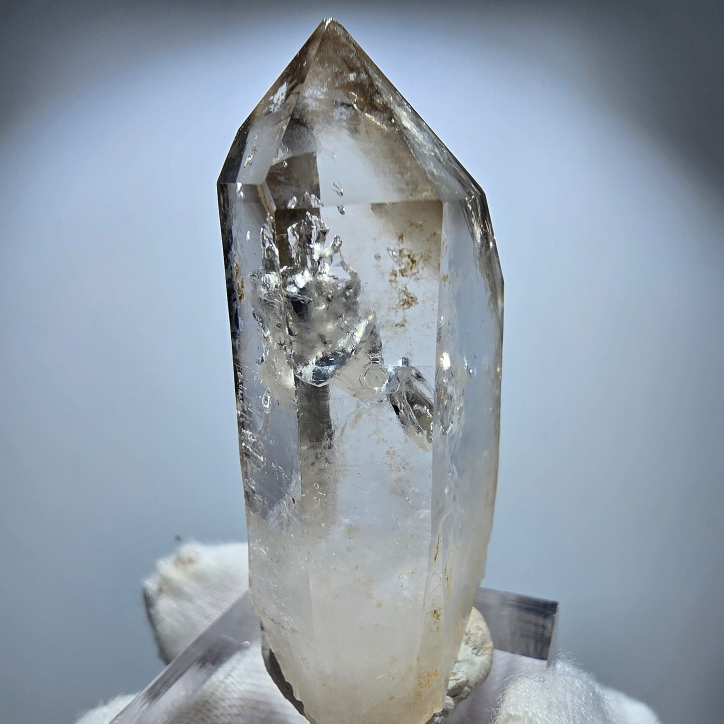 Entdecken Sie die Schönheit und Seltenheit dieses klaren Phantom Rauchquarz Zepter Spitzes aus Namibia. Dieser außergewöhnliche Kristall zeigt eine einzigartige braun-weiße transparente Kristallbildung, ergänzt durch faszinierende Phantome, die im Inneren sichtbar sind. Seine Zepter-Kristallform (Zepter Quarz) zusammen mit den beeindruckenden fensterförmigen Einschlüsse (Fensterquarz) machen dieses Stück zu einem wahren Sammlerstück.