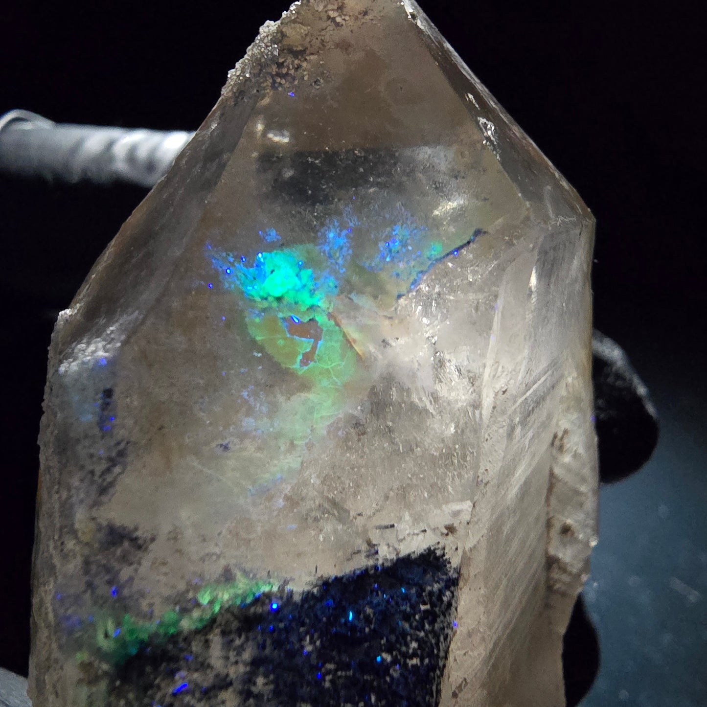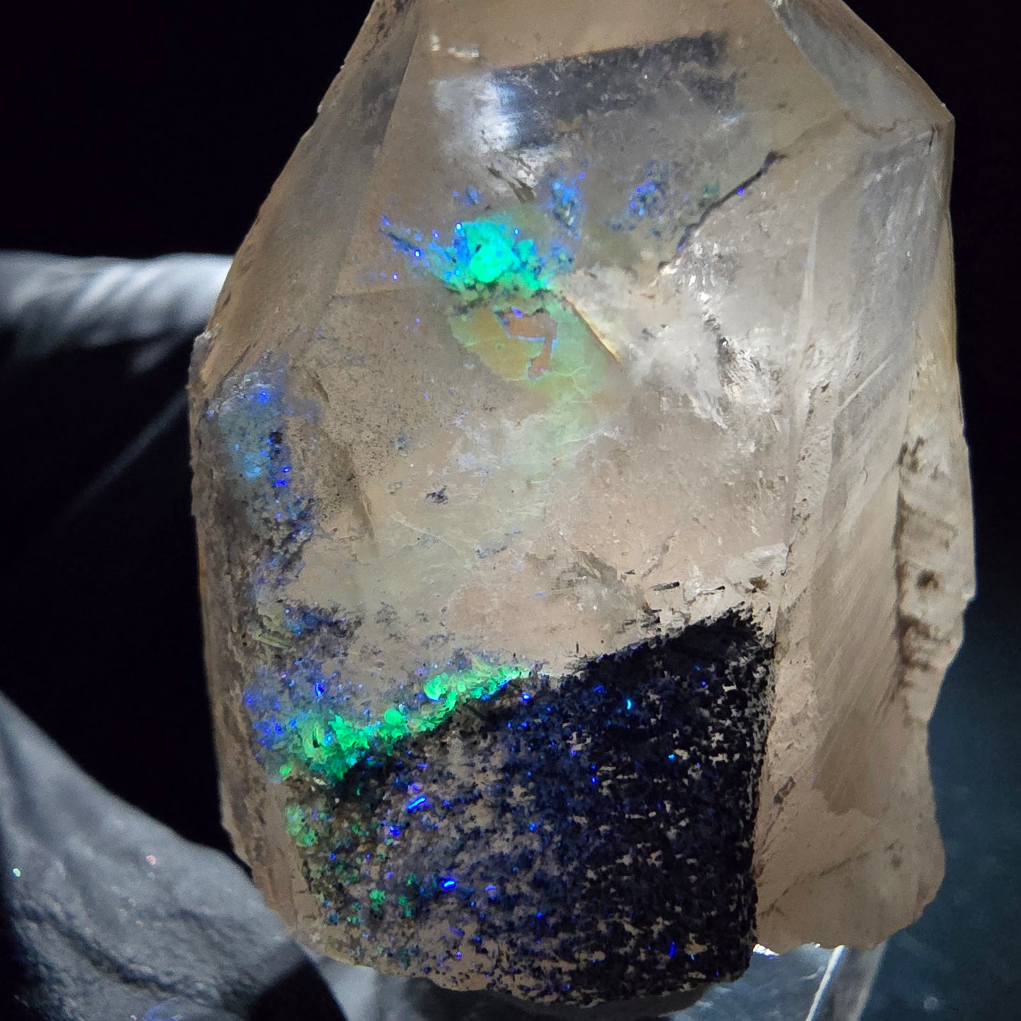 - Besonderheiten: Schörl Turmalin Einschüsse, Hyalit Kristalle leuchten unter UV-Licht