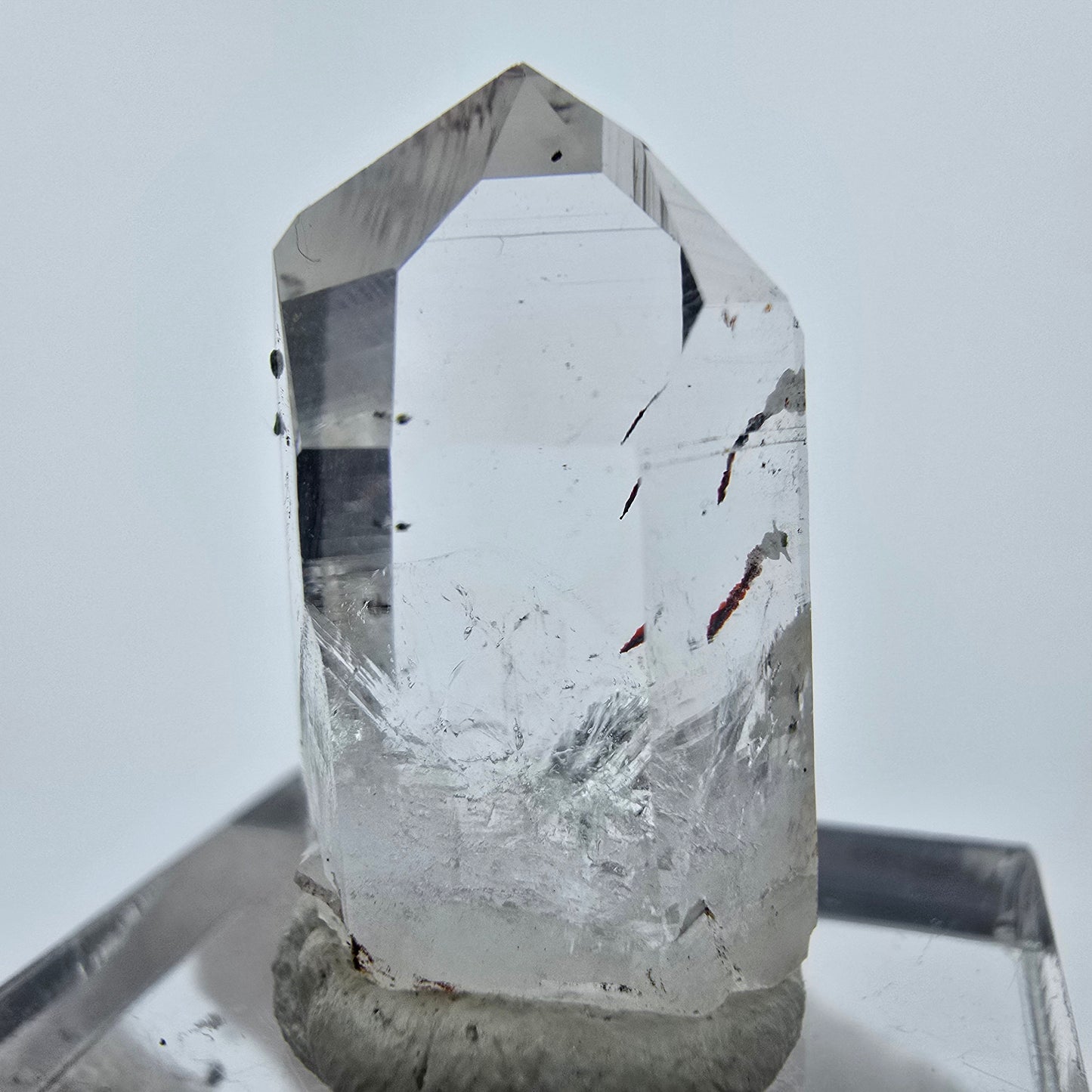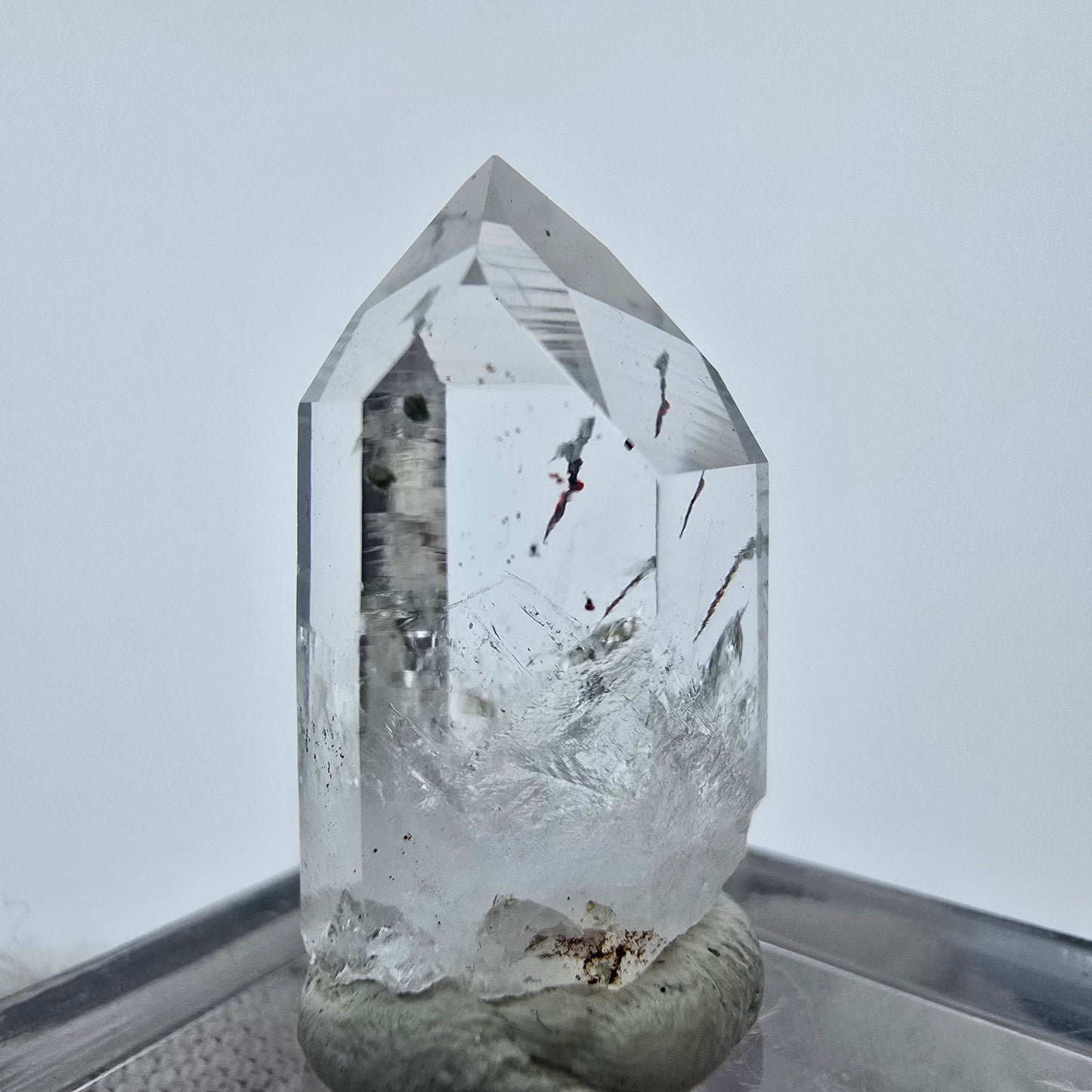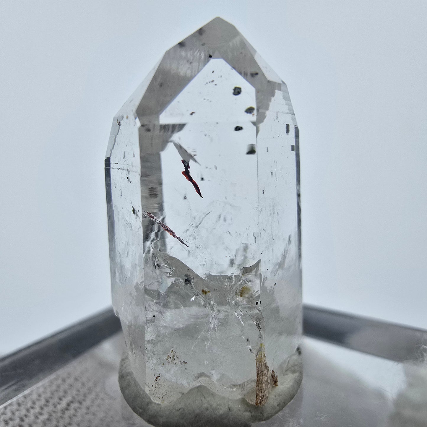 Entdecken Sie die Schönheit des klaren Harlekin Quarz Kristalls, einer seltenen und faszinierenden Kristallspitze. Diese exquisite Kristallspitze besticht durch ihre weiß-transparente Oberfläche und die einzigartigen, im Inneren sichtbaren Hämatit-Einschlüsse in leuchtendem Rot und Schwarz. Der Harlekin Quarz ist nicht nur ein ästhetisches Meisterwerk, sondern auch ein Sammlerstück, das durch seine Seltenheit besticht.