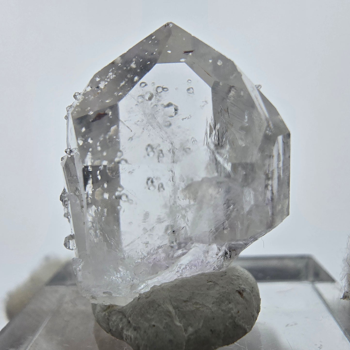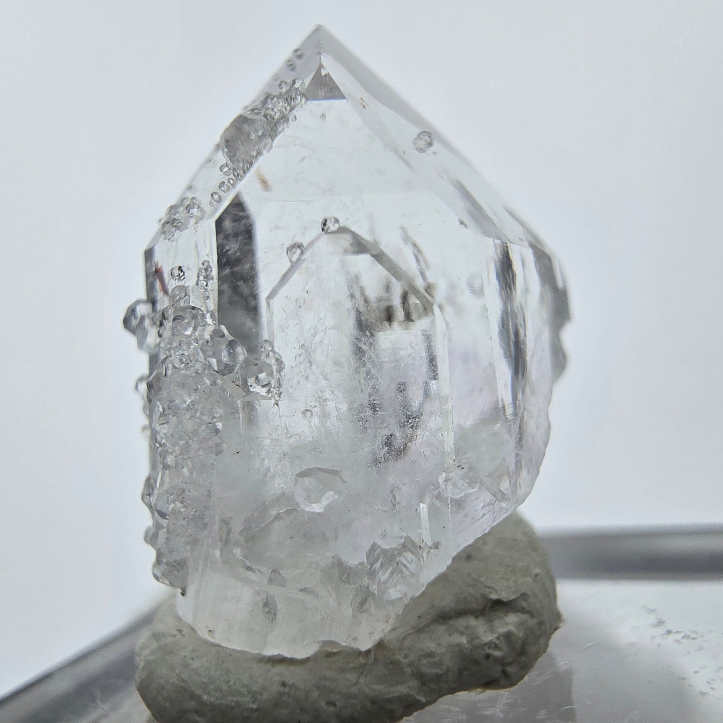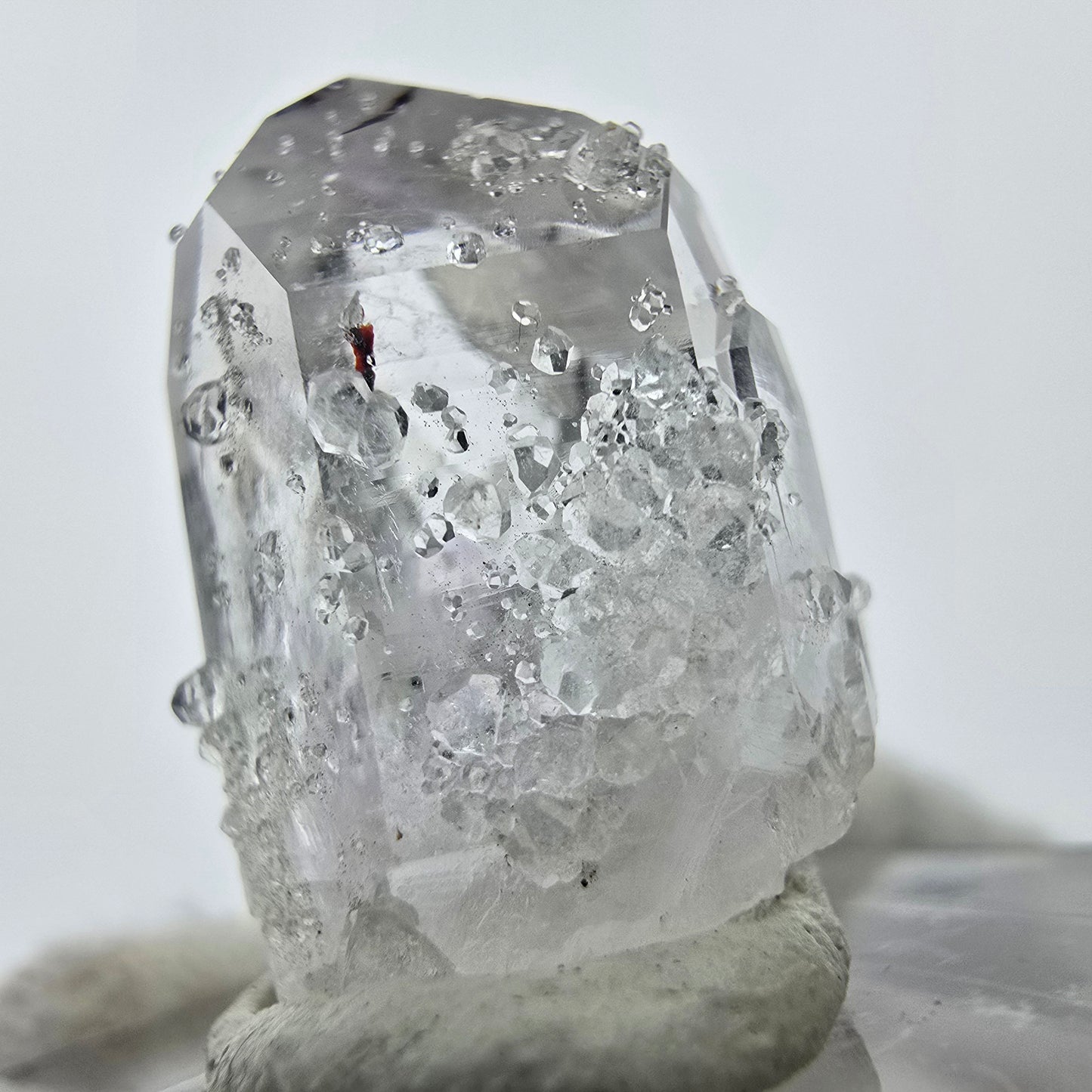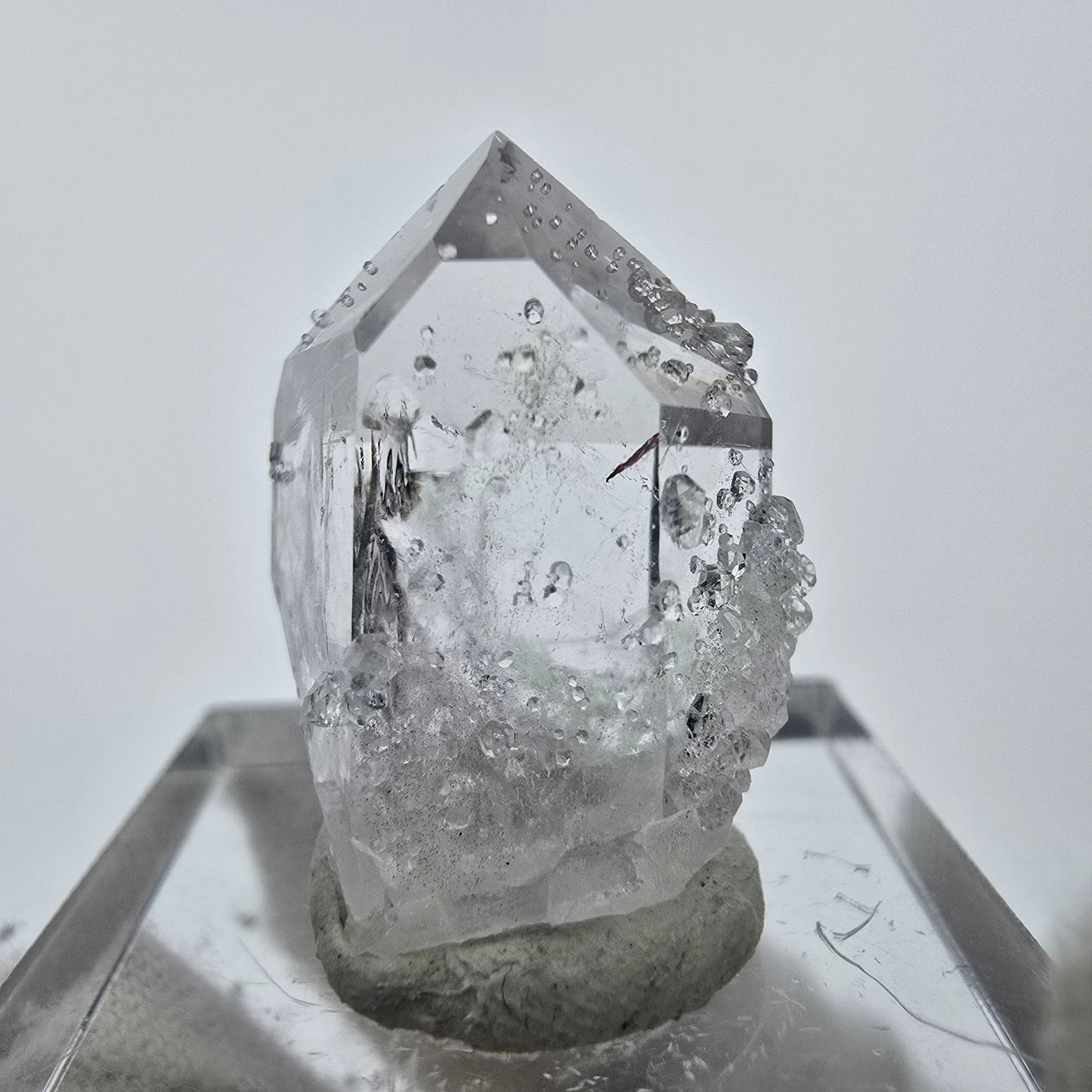 Entdecken Sie diesen außergewöhnlichen klaren Harlekin Quarz, der durch seine seltene und beeindruckende Kristallspitze besticht. Mit einer weiß-transparenten Kristallspitze, die obendrein die faszinierenden, rot glänzenden Hämatit-Einschlüsse im Inneren zur Schau stellt, ist dieser Kristall eine farbenfrohe Bereicherung für jede Sammlung. Kleine, weiß-transparente Analcim Kristalle sind auf der Oberfläche des Kristalls gewachsen und verleihen ihm eine zusätzliche Dimension der Schönheit.