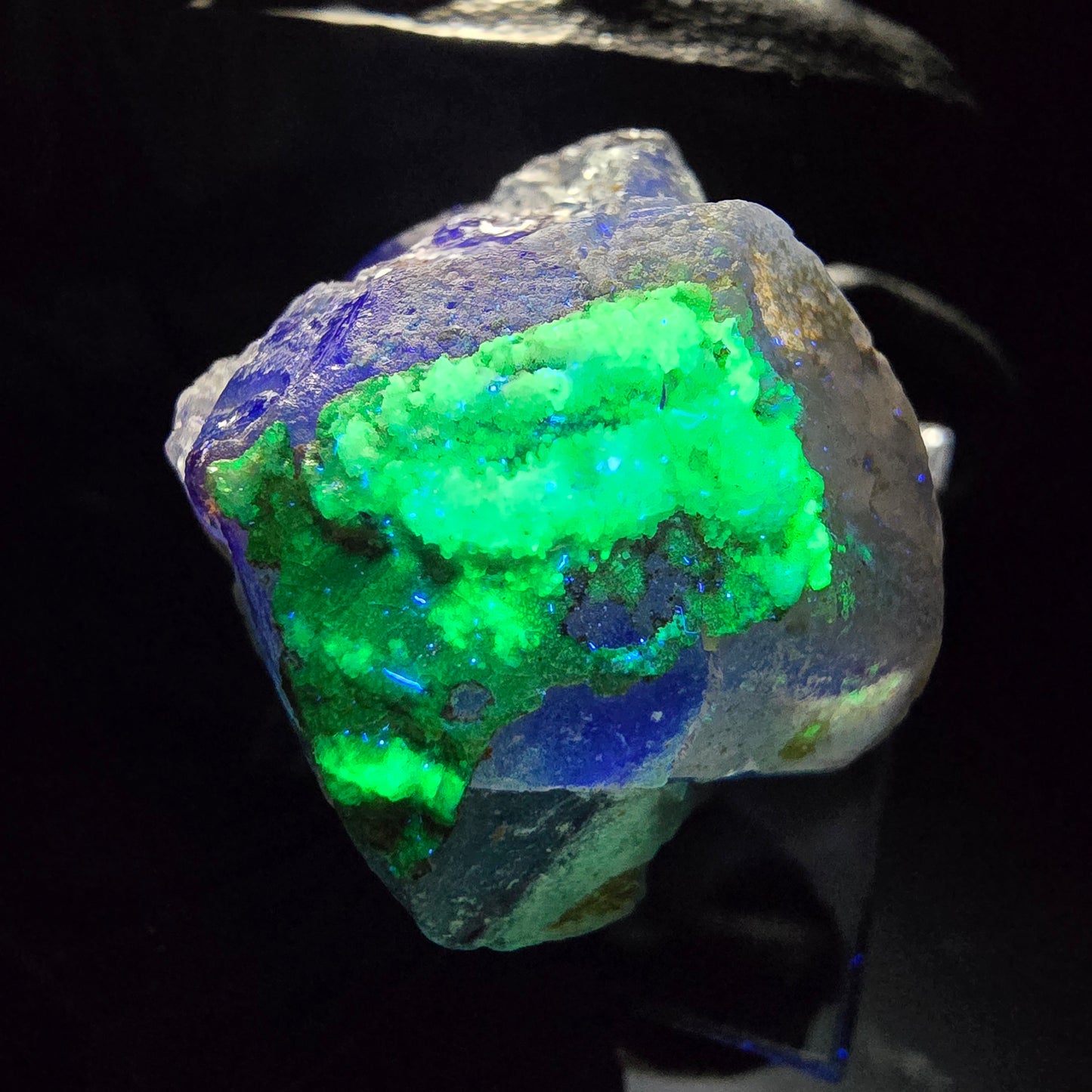 - Particolarità: Cristalli di ialite che brillano di giallo neon sotto la luce UV