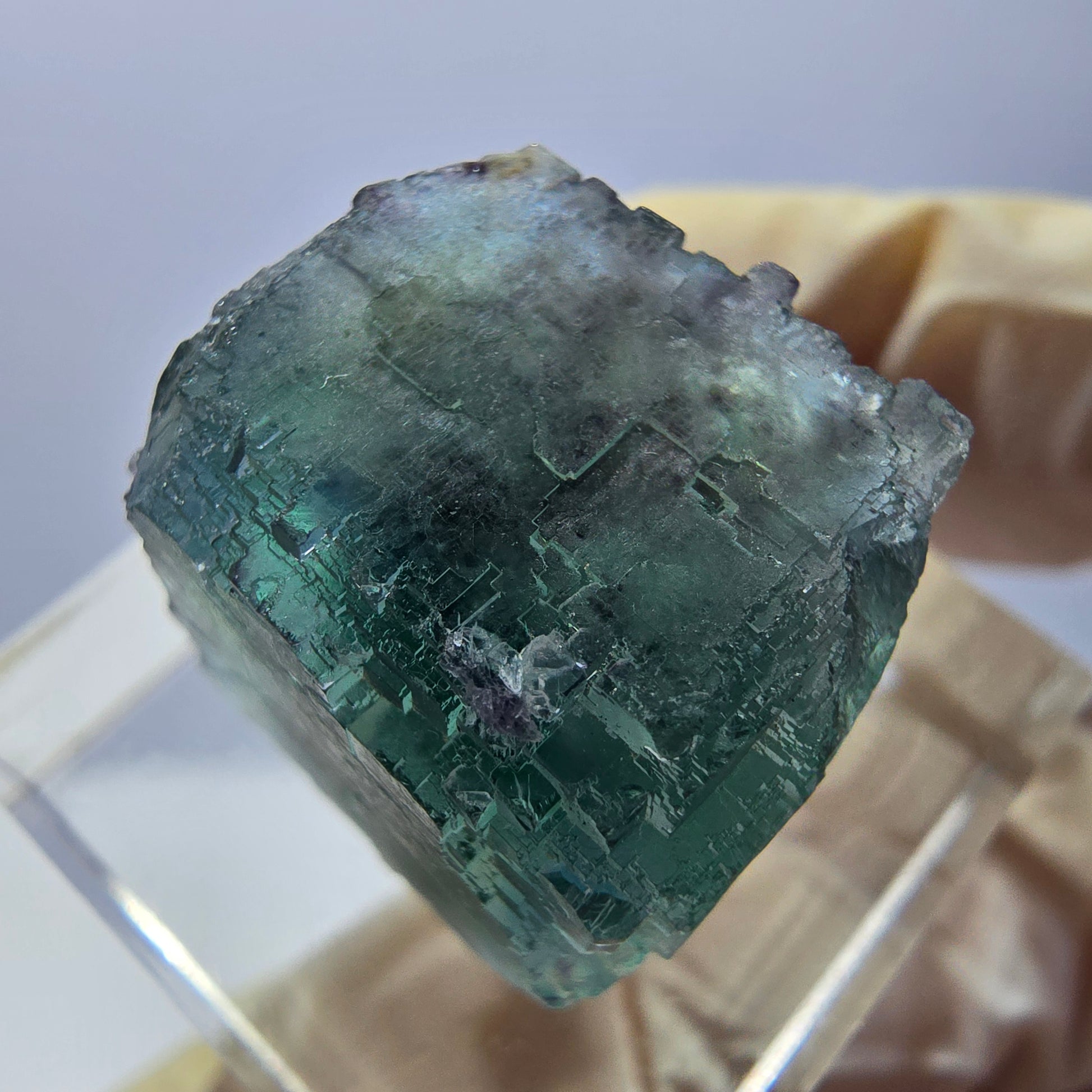 Entdecken Sie unseren klaren, grün transparenten Phantom Fluorit Würfel Kristall. Dieser eindrucksvolle Kristall überzeugt durch seine kubische Form und eine parkettierte Oberfläche, die in jedem Licht schimmert. Die wunderschönen Phantome im Inneren erzeugen faszinierende Effekte und machen jeden Würfel zu einem Unikat.