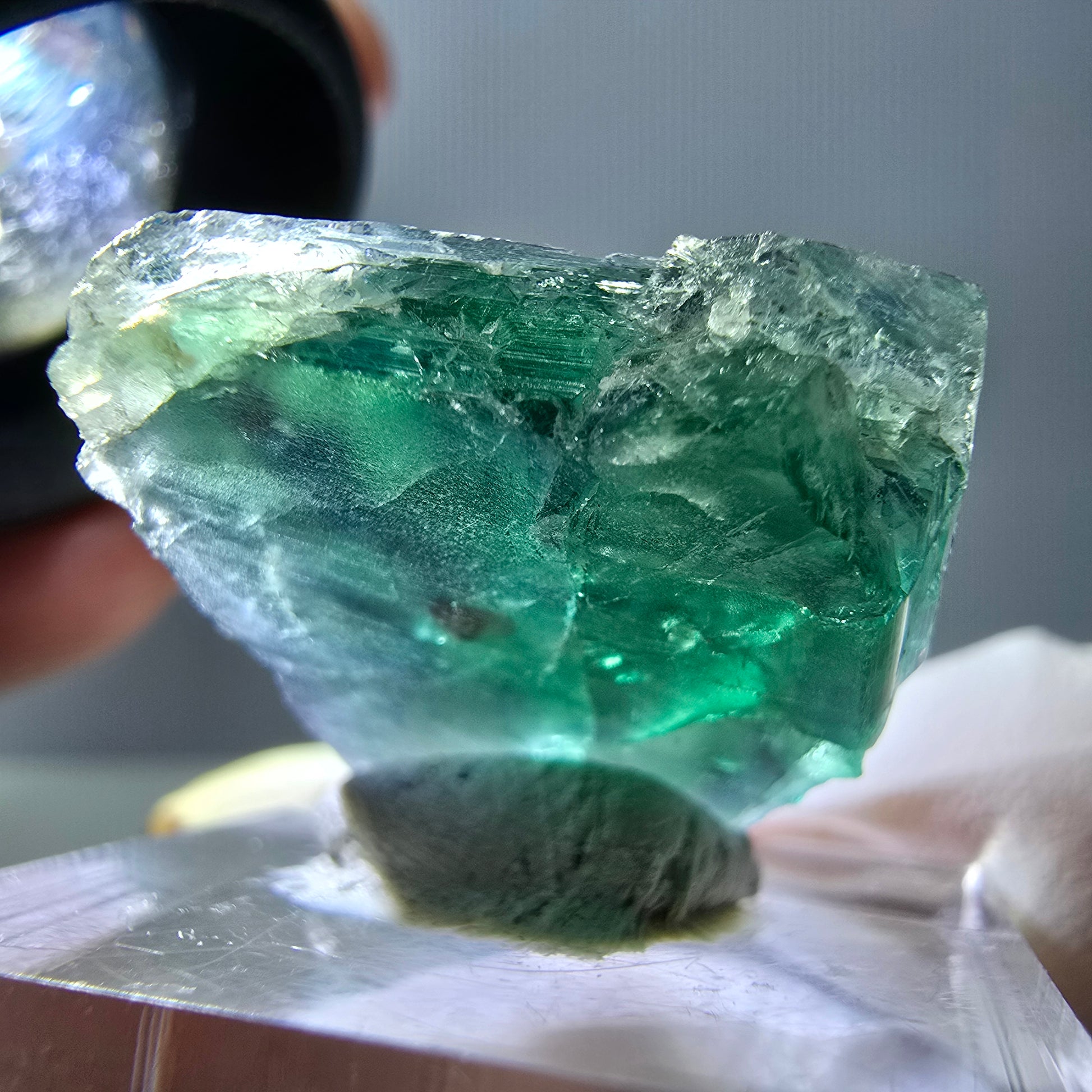 Der klare grüne transparente Phantom Fluorit Würfel ist ein faszinierendes Schmuckstück aus der Natur. Mit seinen eindrucksvollen Phantomen im Inneren fasziniert dieser Kristall Sammler und Liebhaber gleichermaßen. Seine kubische Kristallform und die parkettierte Oberfläche verleihen ihm eine besondere ästhetische Qualität, die in jeder Sammlung hervorstechen wird. Die Maße des Kristalls betragen 20*17*17mm und das Gewicht liegt bei 10g. Der Fluorit stammt aus der Fundstelle Okorusu in Namibia und ist somit ein einzigartiges Sammlerstück.