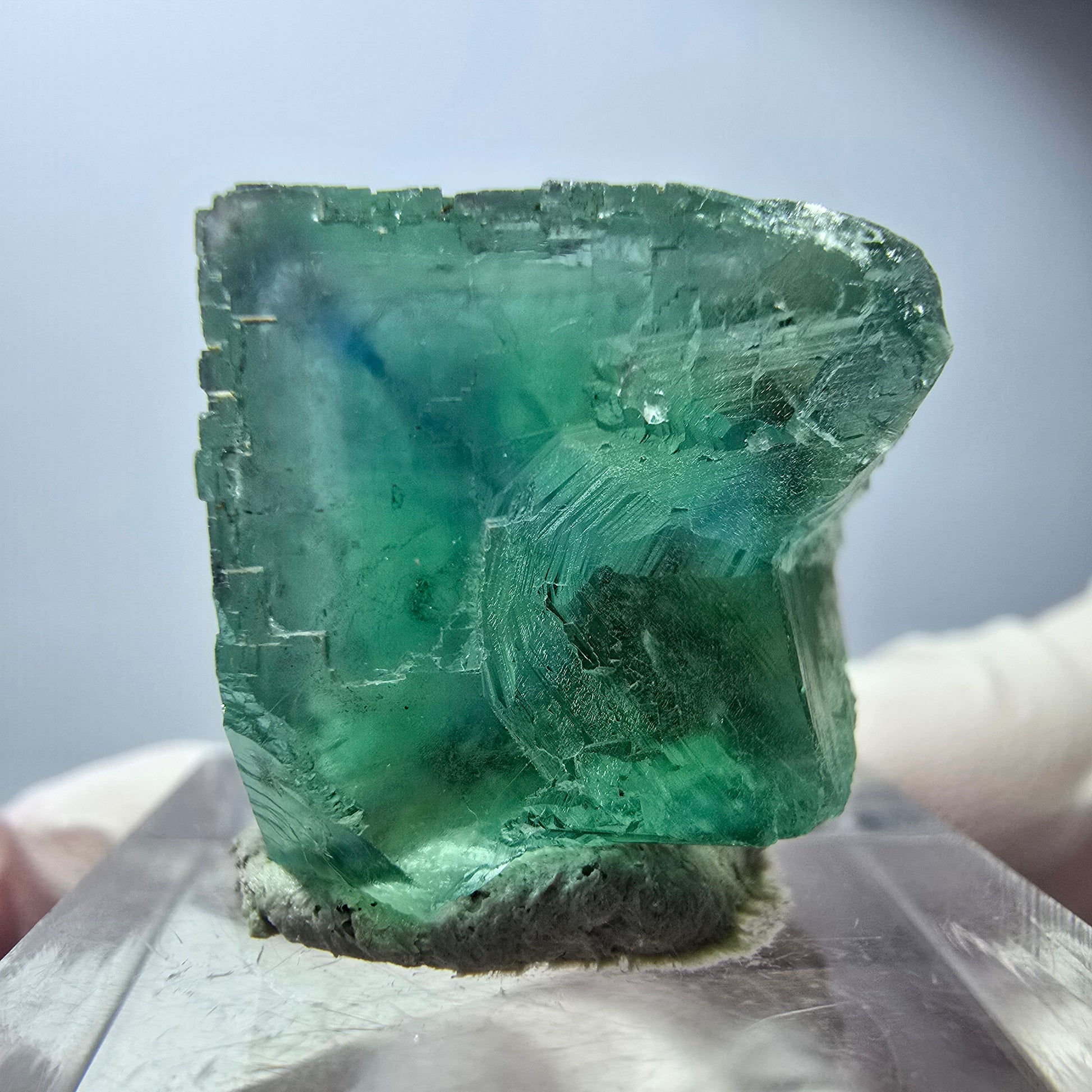 Entdecken Sie unser einzigartiges Stück, den klaren grünen Phantom Fluorit Würfel - ein faszinierender Kristall, der sowohl in der Optik als auch in der Ausstrahlung begeistert. Dieser kubische Kristall besticht durch seine parkettierte Oberfläche und die beeindruckenden Phantome, die im Inneren sichtbar sind. Die grüne Transparenz verleiht ihm eine besondere Eleganz und macht ihn zu einem Blickfang in jeder Sammlung.