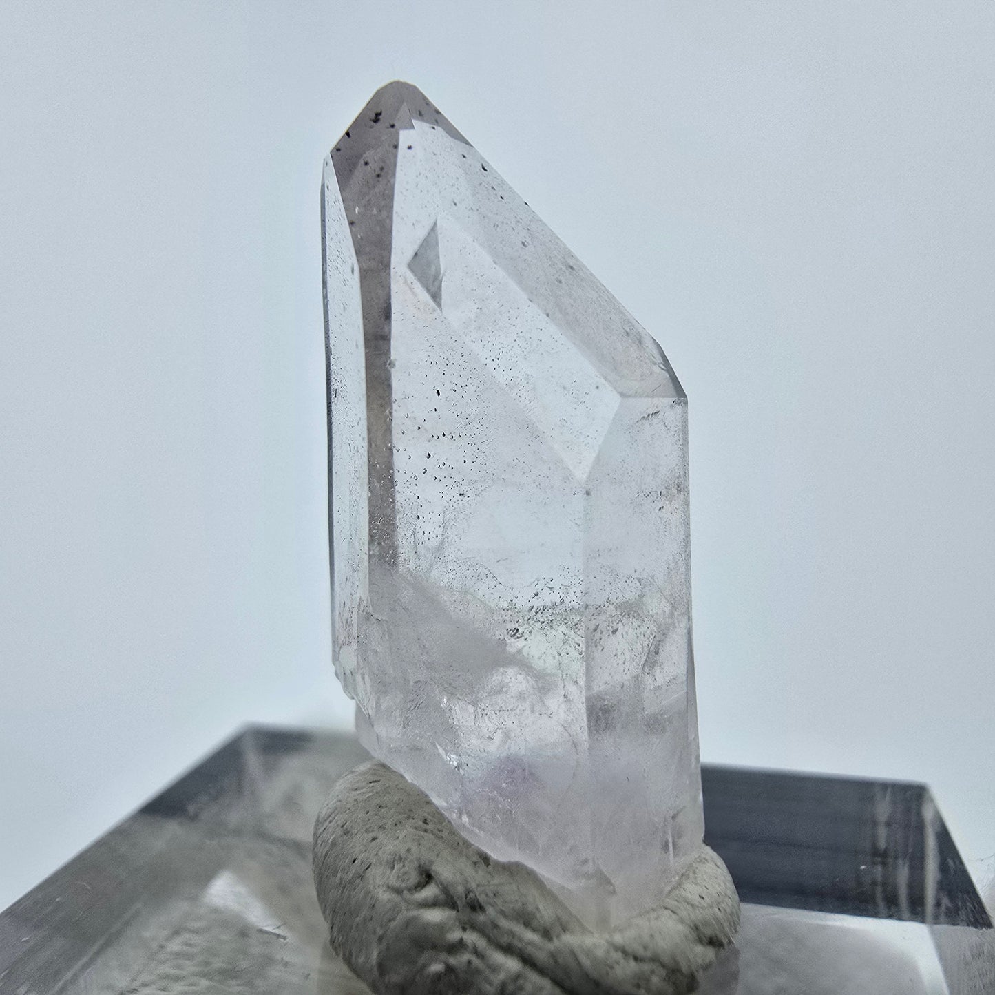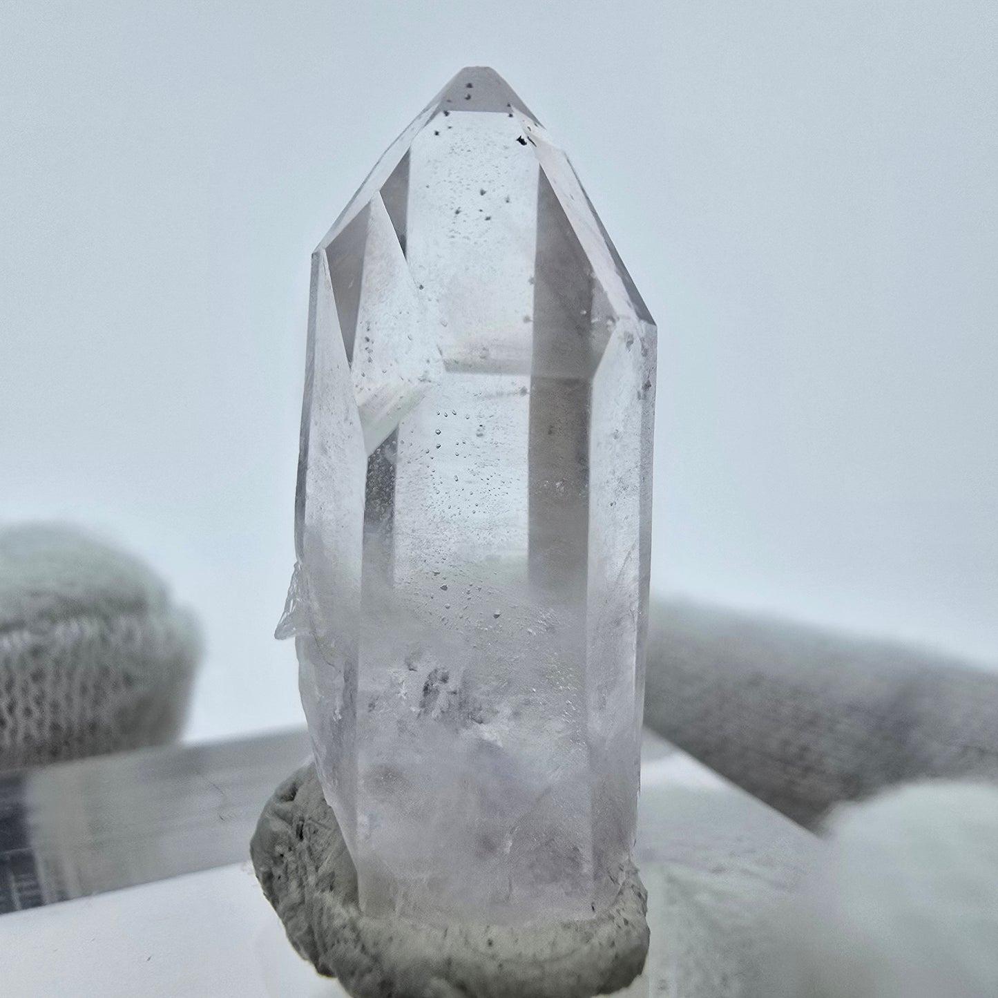 Entdecken Sie diesen einzigartigen klaren Quarz Kristall mit faszinierenden, seltenen hämatitischen Einschlüssen und beeindruckenden Phantomen im Inneren. Diese exquisite Kristallspitze stammt aus der Streep Mine in Goboboseb, Namibia, und ist nicht nur ein wunderschönes Sammlerstück, sondern auch ein echte Augenweide für alle Liebhaber von Mineralien und Kristallen.