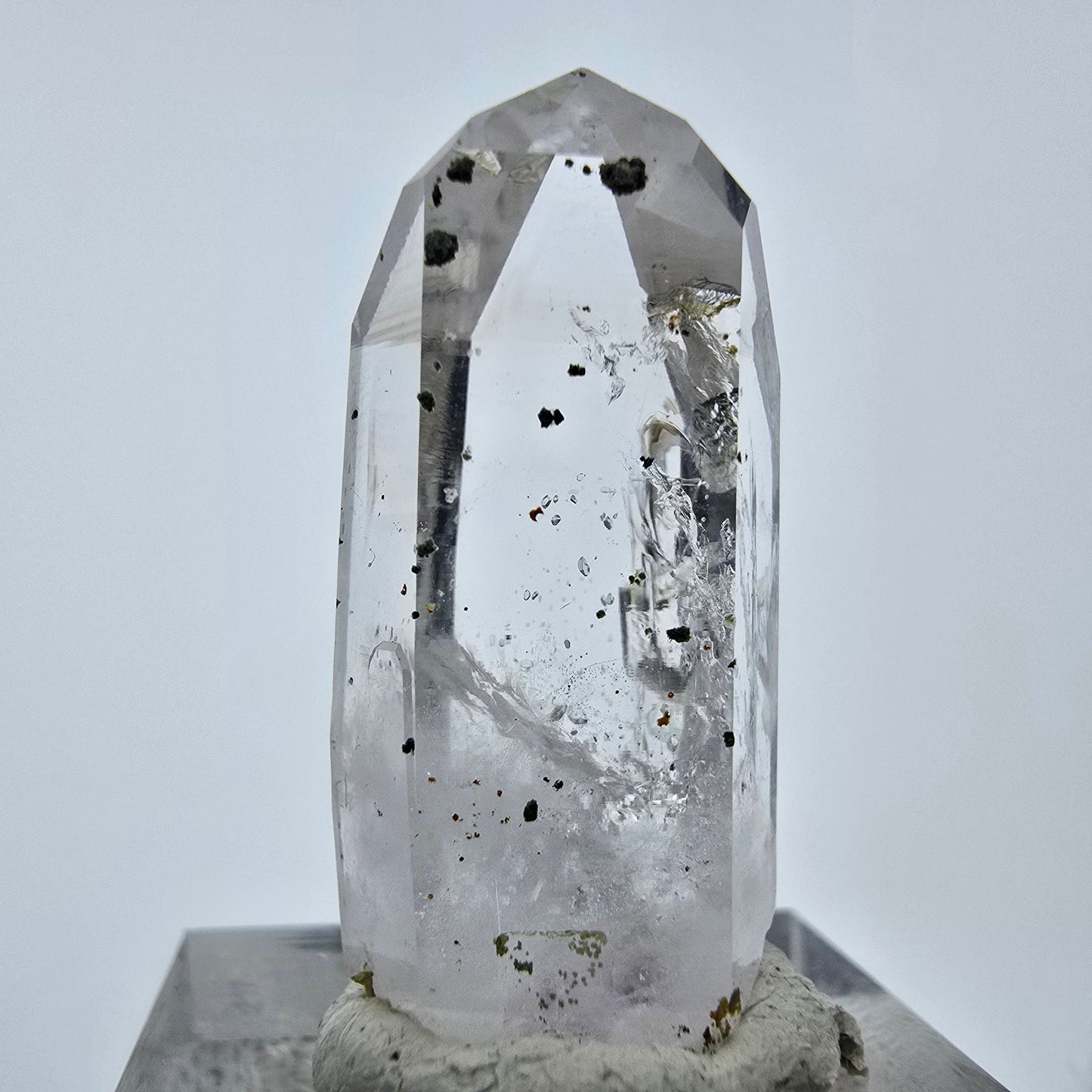 Entdecken Sie den klaren Phantom Hämatit Quarz Kristall, eine seltene und faszinierende Naturerscheinung. Dieser außergewöhnliche Kristall vereint die Schönheit klaren und transparenten Quarzes mit einzigartigen schwarzen Hämatit Einschlüssen und atemberaubenden Phantomformationen im inneren. Jeder Kristall erzählt seine eigene Geschichte und zieht mit seiner einzigartigen Optik alle Blicke auf sich.
