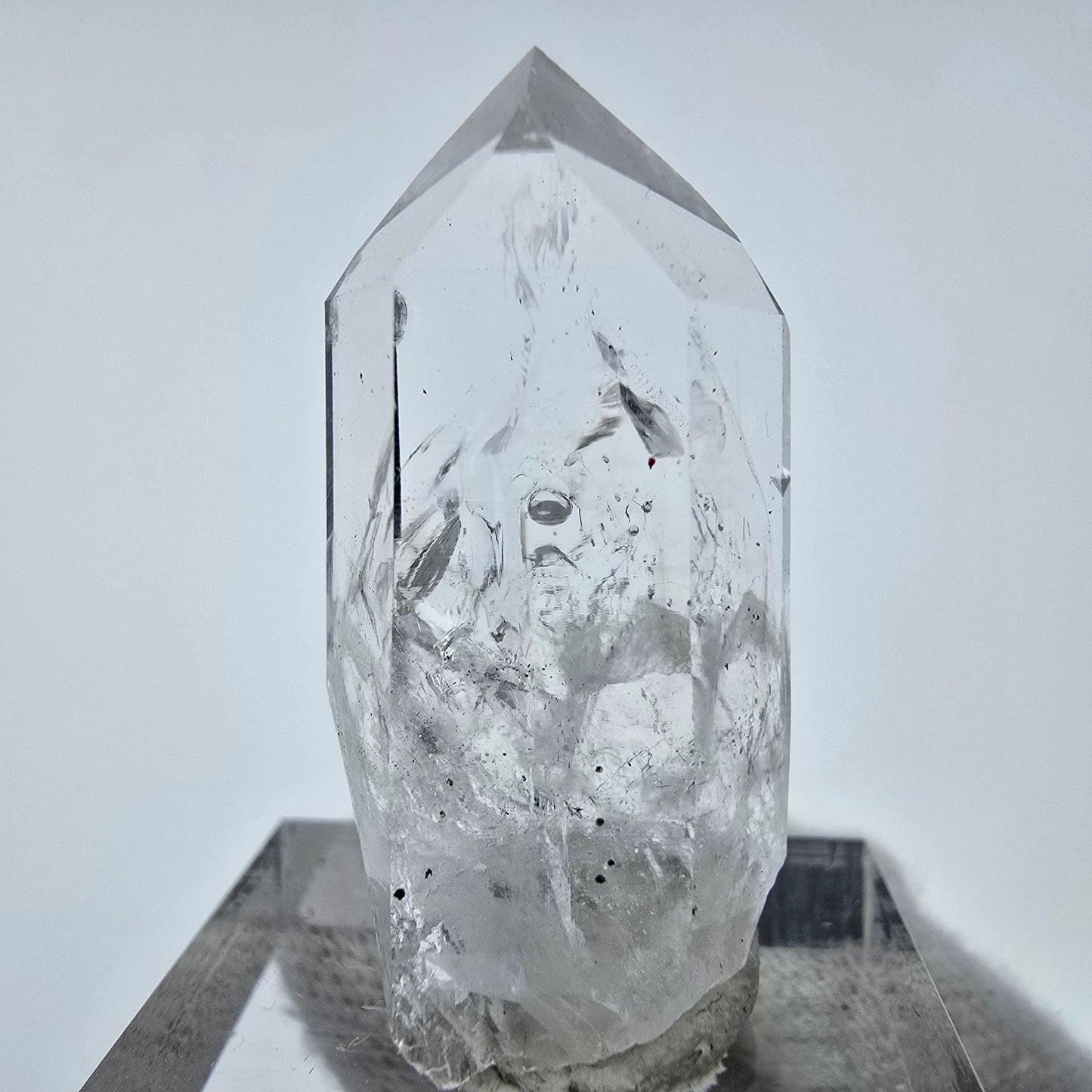 Entdecken Sie die Schönheit des Klaren Phantom Hämatit Quarz Kristalls – einen einzigartigen und faszinierenden Naturstein, der durch seine klaren, weißen und transparenten Eigenschaften besticht. Diese außergewöhnliche Quarz Kristallspitze beherbergt seltene schwarze Hämatit Einschlüsse sowie beeindruckende Phantom-Strukturen, die im Inneren des Steins verborgen sind und ihn zu einem wahren Blickfang machen.