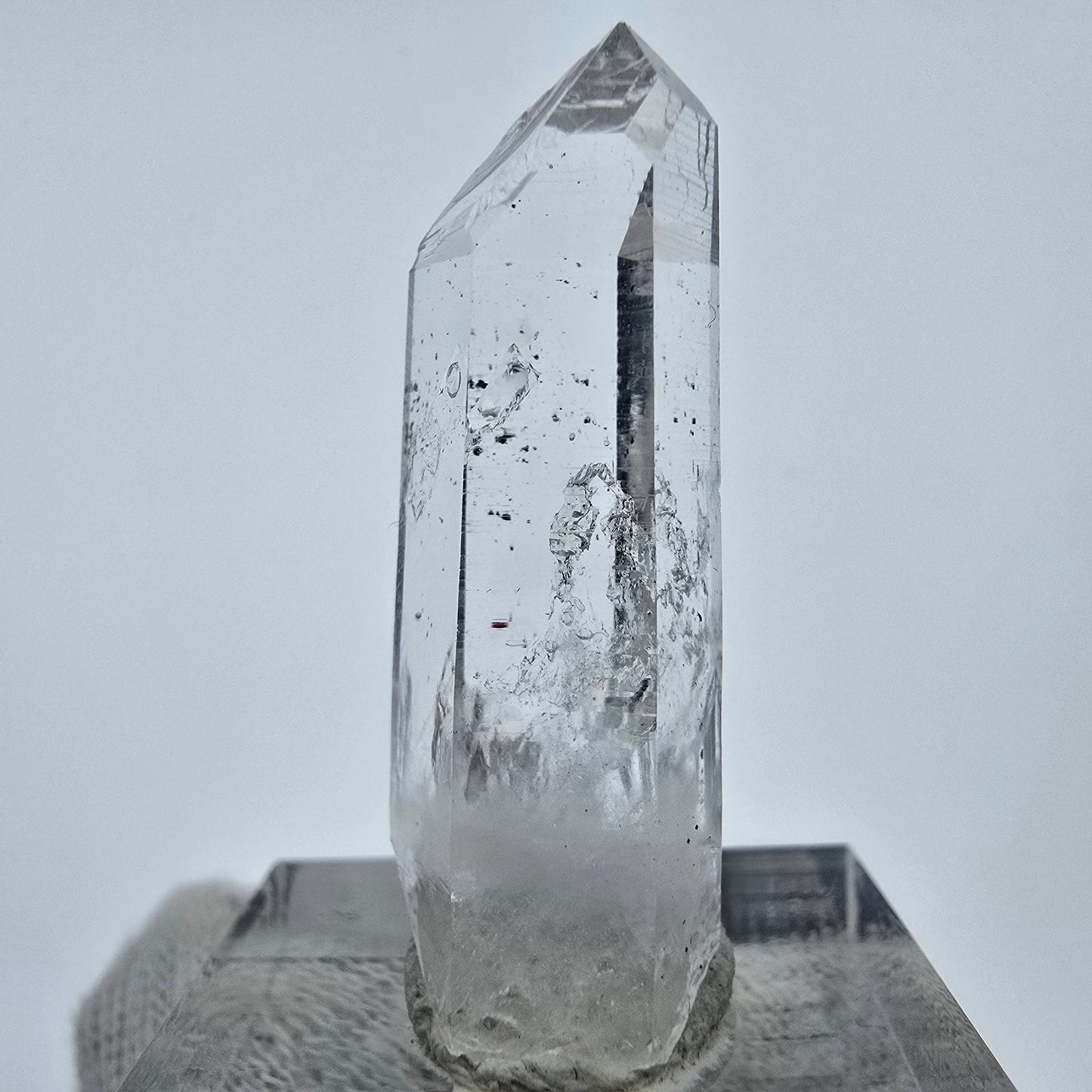Die Abmessungen des Kristalls sind 35 mm in der Höhe, 12 mm in der Breite und 9 mm in der Tiefe, mit einem Gewicht von nur 6 g. Hergestellt aus dem erlesenen Material aus der Streep Mine, Goboboseb in Namibia, stellt dieser Quarz eine exklusive Bereicherung für jede Sammlung dar.