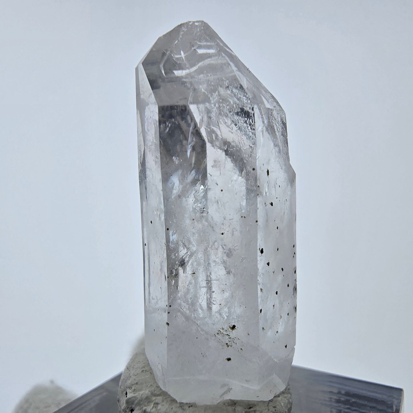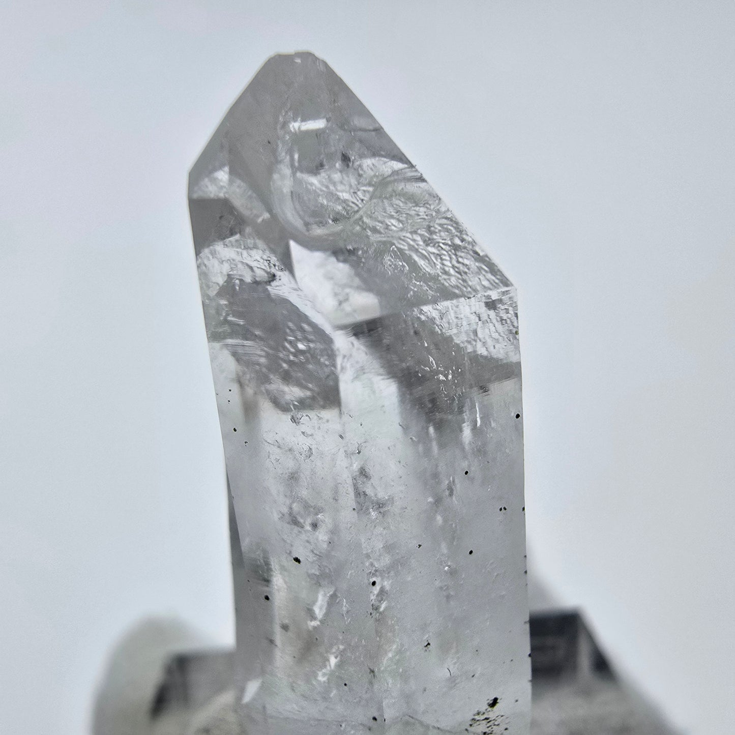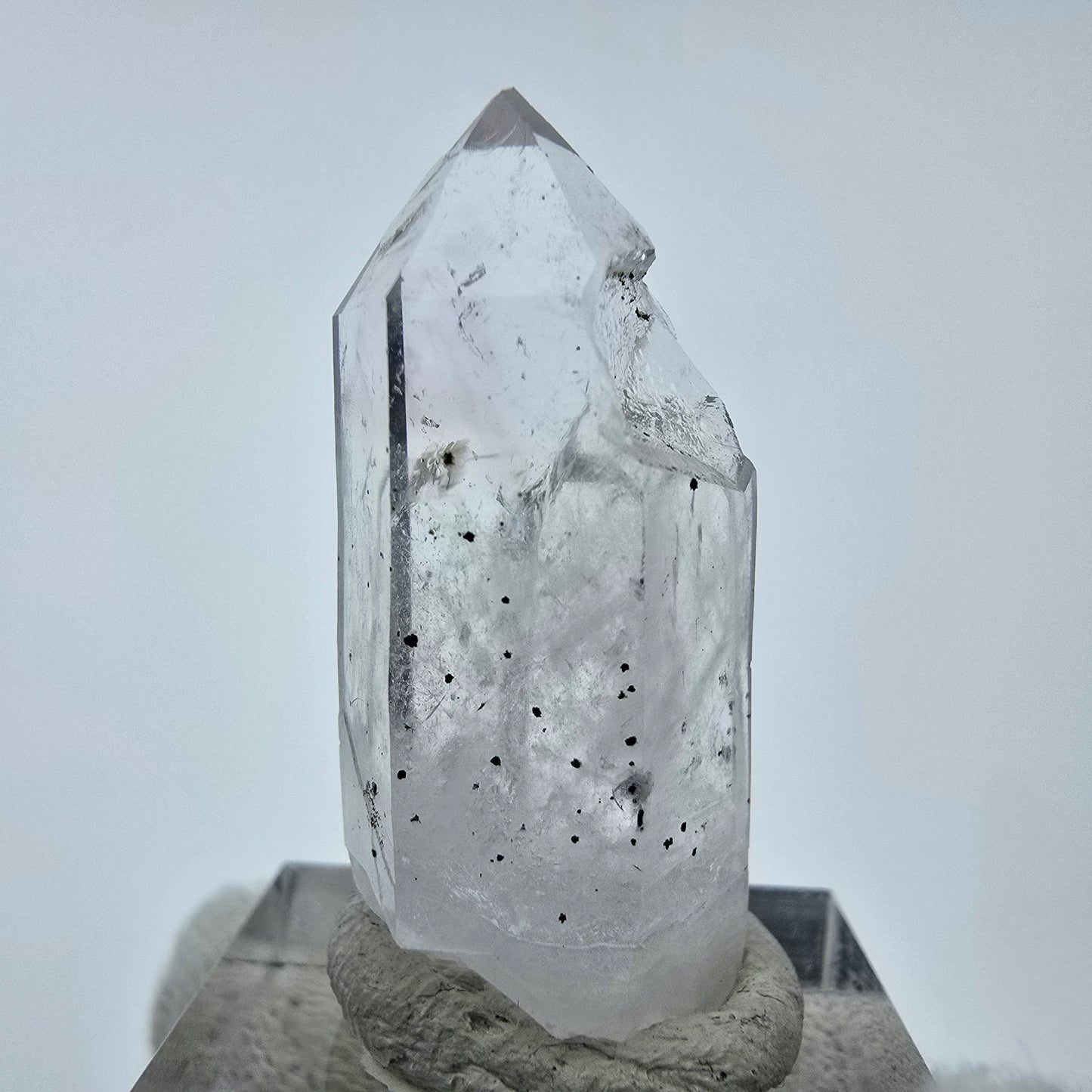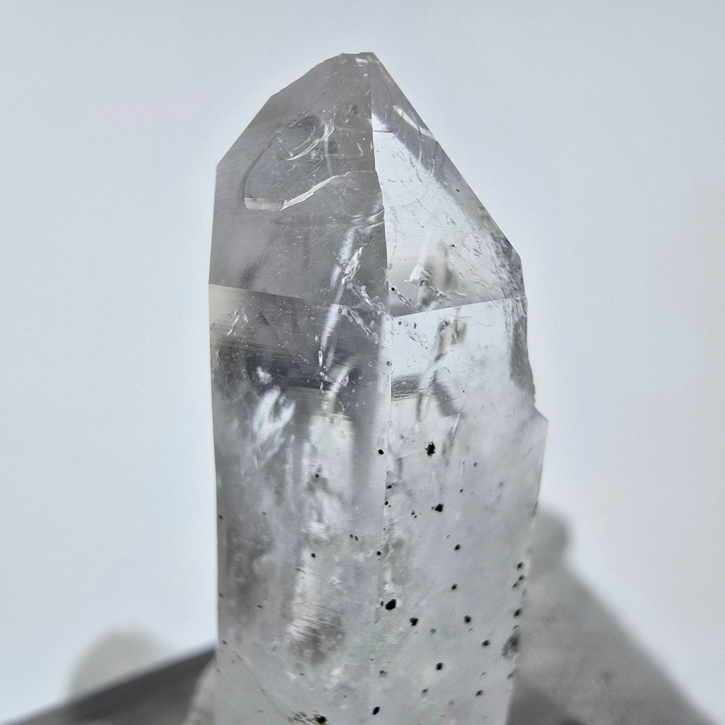 Entdecken Sie den faszinierenden klaren Hämatit Quarz Kristall, der mit seinen einzigartigen Eigenschaften sowohl Sammler als auch Liebhaber von Mineralien begeistern wird. Diese seltene Quarz Kristallspitze ist vollkommen klar und transparent, mit besonderen, seltenen schwarzen Hämatit Einschlüssen, die ihr ein außergewöhnliches Aussehen verleihen. Die atemberaubenden Phantome im Inneren des Kristalls sorgen für ein zusätzliches visuelles Highlight und machen jedes Stück zu einem unverwechselbaren Unikat.