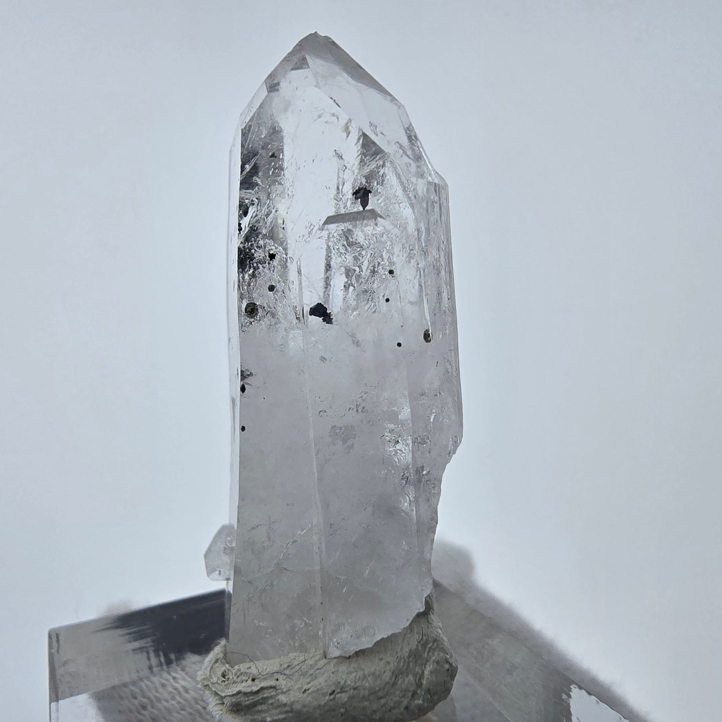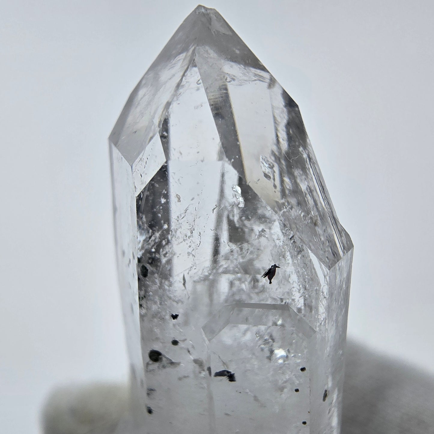Entdecken Sie unseren seltenen klaren weiß transparenten Quarz Kristall mit einzigartigen schwarzen Hämatit Einschlüssen und schönen Phantomen im Inneren. Jeder Kristall ist ein Meisterwerk der Natur und bietet eine faszinierende Ansicht durch seine außergewöhnliche innere Beschaffenheit.