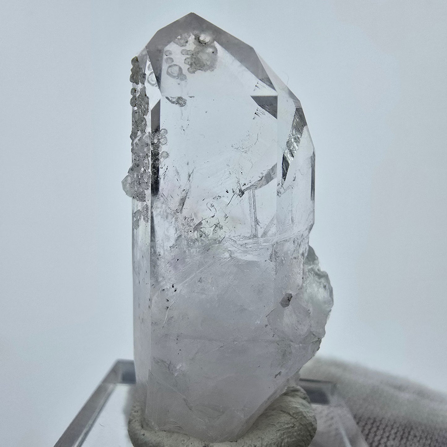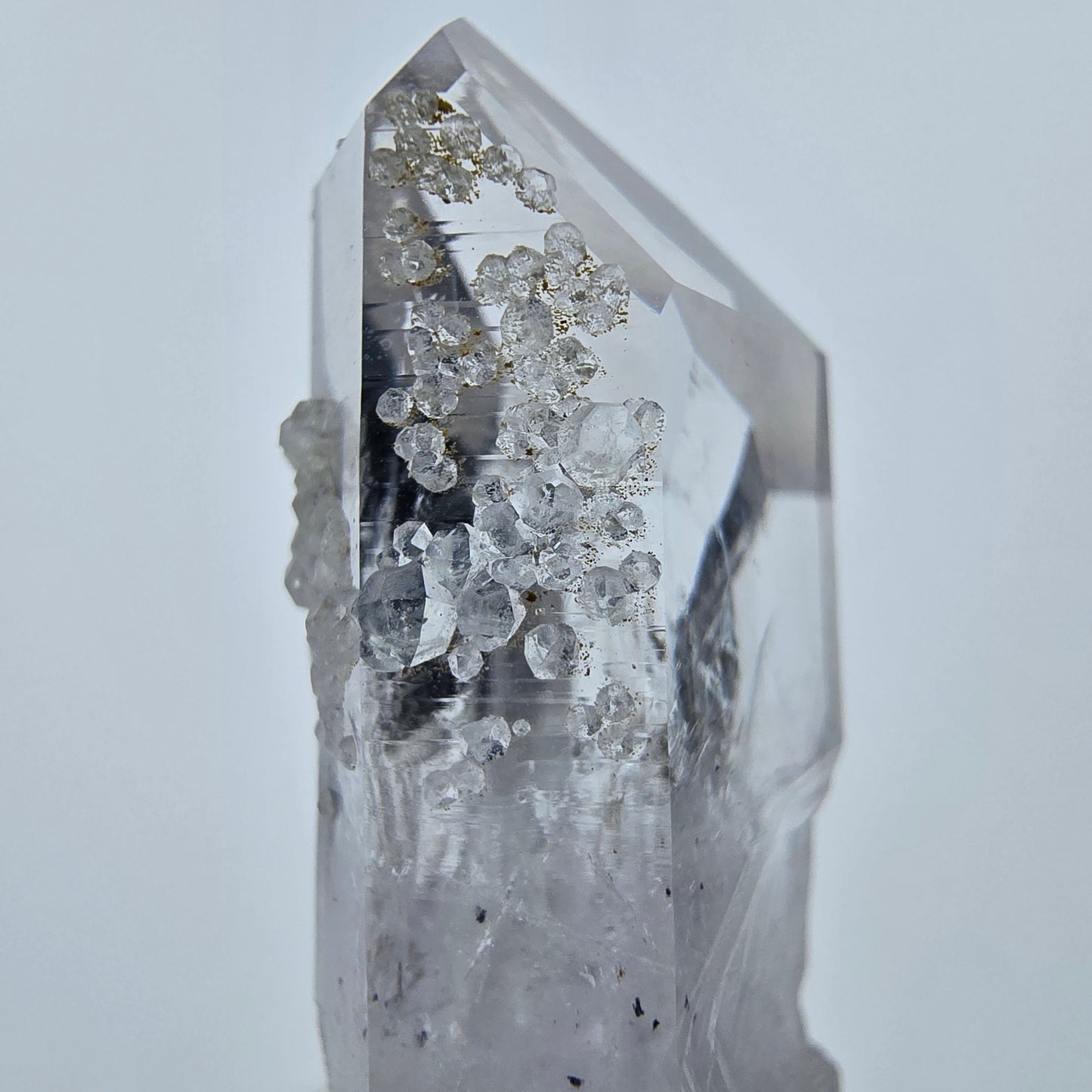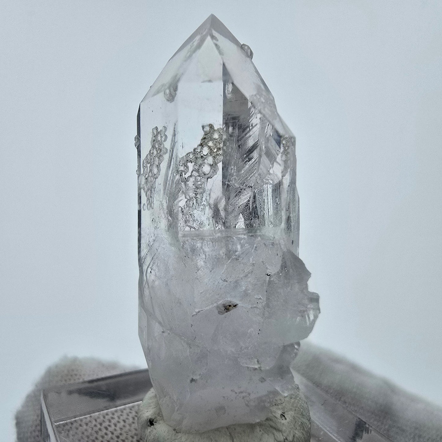 Die Oberfläche des Kristalls ist mit kleinen Noppen aus Analcim-Kristallen verziert, die ihm eine einzigartige Textur und einen besonderen Charme verleihen. Mit den Maßen von 40 mm x 19 mm x 10 mm und einem Gewicht von nur 10 g ist dieser Zepterquarz nicht nur ein Blickfang, sondern auch leicht zu handhaben und zu präsentieren.