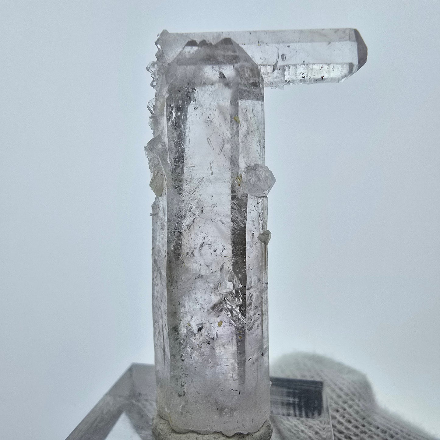 Entdecken Sie die einzigartige Lemurian Phantom Quarz Formation, eine seltene und beeindruckende Kristallformation aus klaren, weiß-transparenten Quarzspitzen. Diese zusammengewachsenen Spitzen sind nicht nur ein schöner Anblick, sondern beherbergen auch faszinierende Phantome im Inneren sowie malerisch gewachsene horizontale Querrillen an der Oberfläche, die typisch für Lemurian Quarz sind.