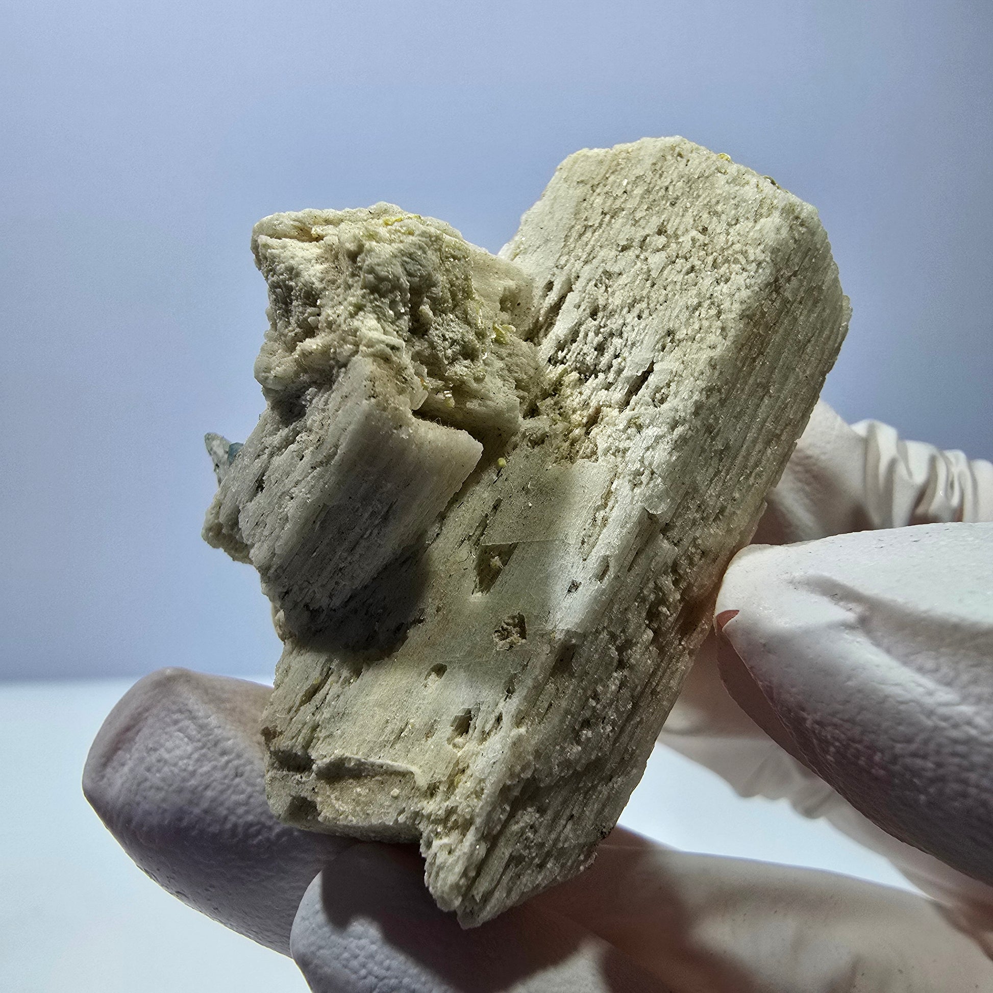 Diese seltene Mineralienstufe aus Erongo, Namibia, vereint gelbe Hyalit-Opal Kristalle, die unter UV-Licht neongelb fluoreszieren, mit weiß-beigen Orthoklaskristallen. Ergänzt wird das Ensemble durch braun transparente Rauchquarze, schwarze Schörl Turmalin Kristalle und einen kleinen hellblauen Aquamarin Kristall.