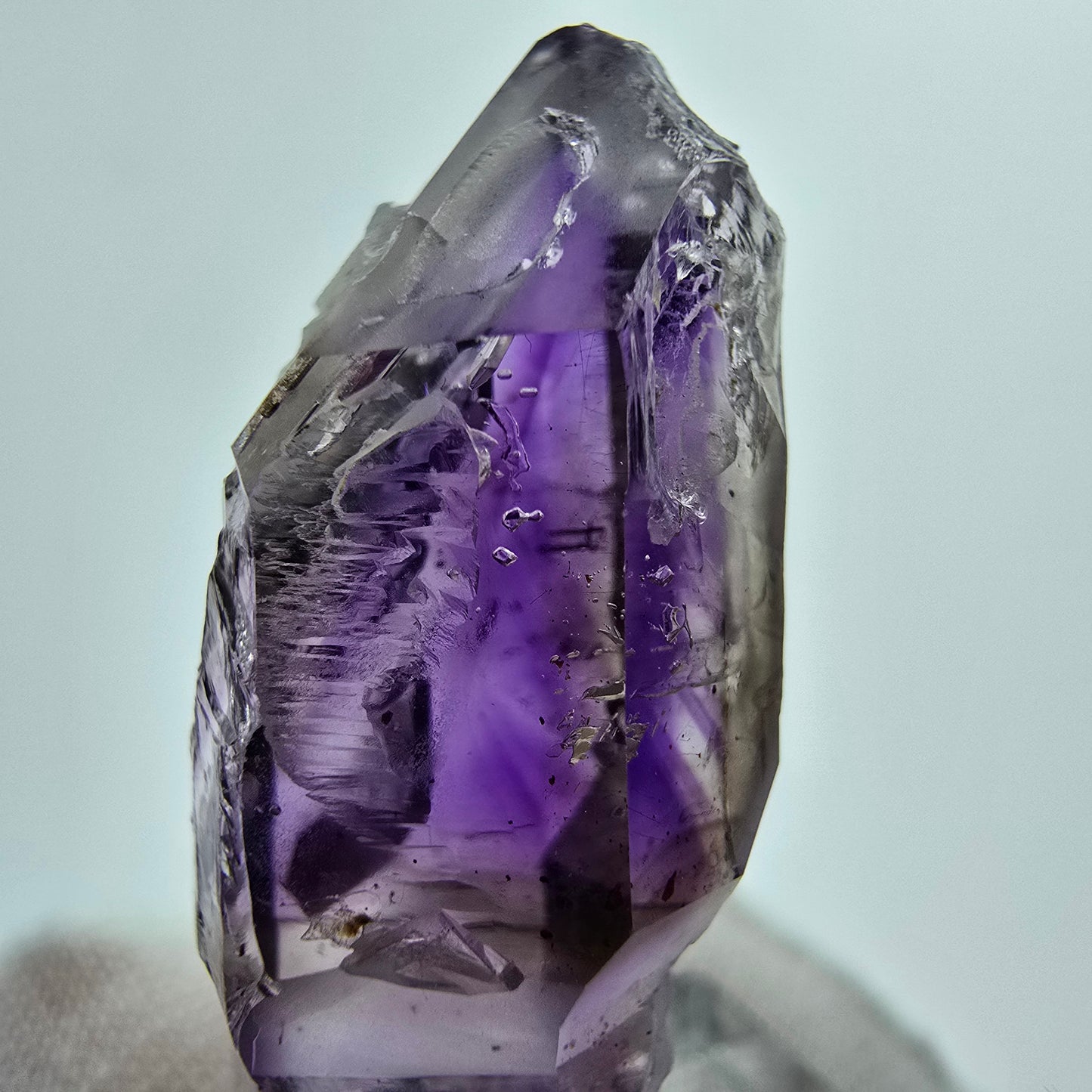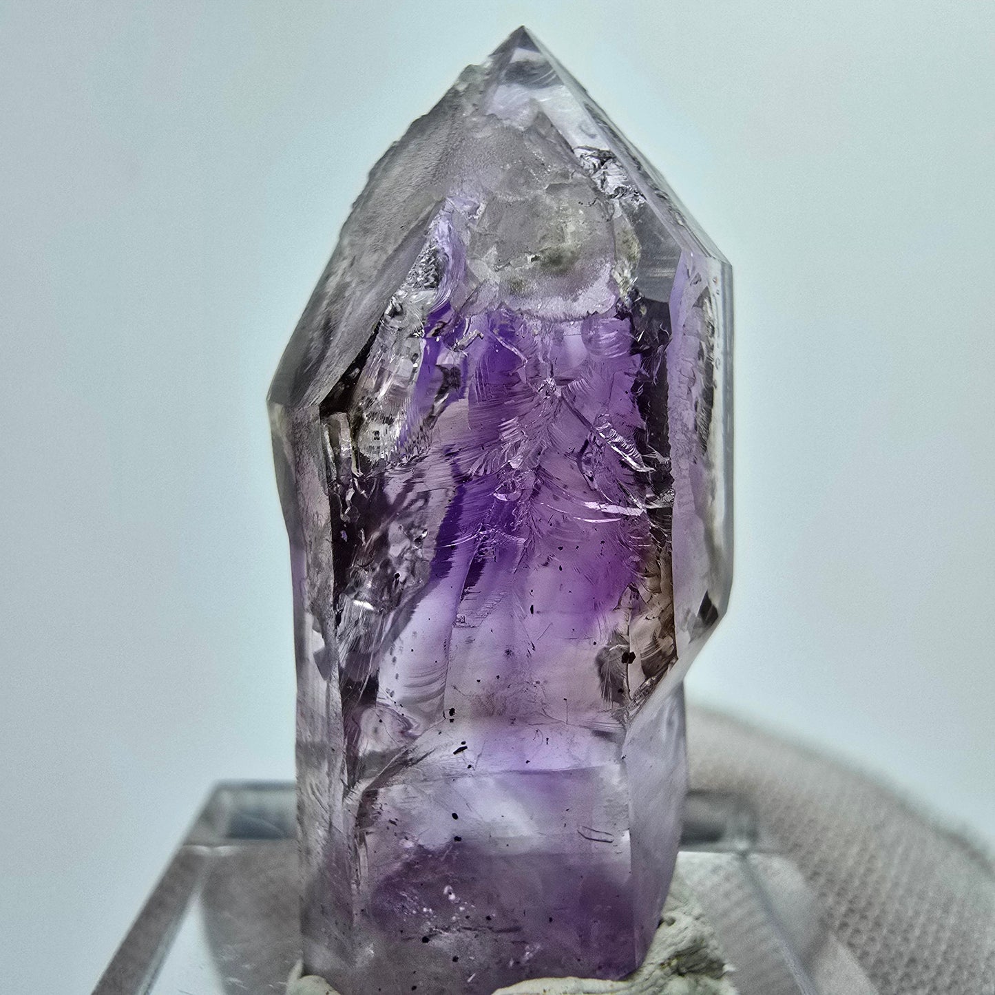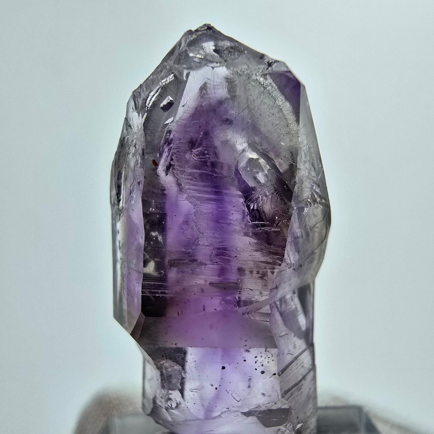 Entdecken Sie diesen beeindruckenden Phantom Amethyst Fenster Zepter Kristall, eine seltene klare Amethyst Kristallspitze, die mit einer wunderschönen lila-braunen transparenten Kristallspitze verzaubert. Ihr Inneres birgt faszinierende Phantome, die den Kristall zu einem einzigartigen Naturwunder machen. Die Zepter-Form (Zepterquarz) verleiht dem Kristall eine majestätische Ausstrahlung.