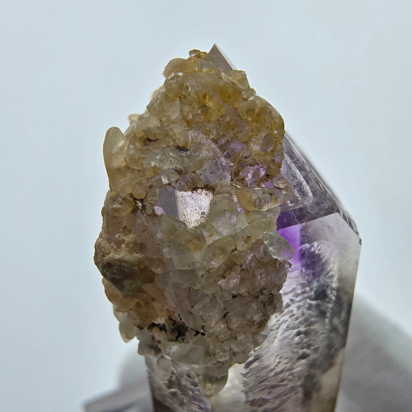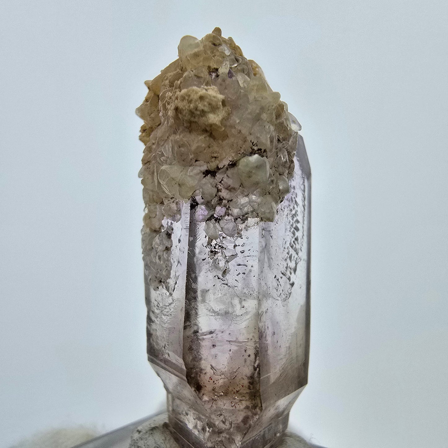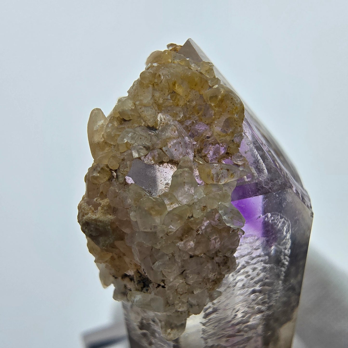 Entdecken Sie unseren einzigartigen Phantom Amethyst, eine außergewöhnliche seltene Amethyst Kristallspitze mit herausragenden Eigenschaften. Dieser Kristall verfügt über eine beeindruckende lila-braune transparente Kristallbildung, die mit wunderschönen Phantomen im Inneren begeistert. Seine Zepter-Kristallform und die fensterförmigen Einschlüsse machen ihn zu einem echten Sammlerstück. Die perfekte Kombination aus Ästhetik und Seltenheit!