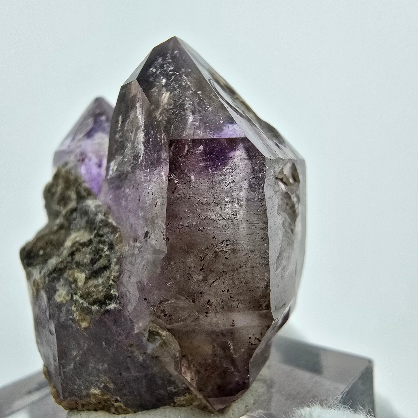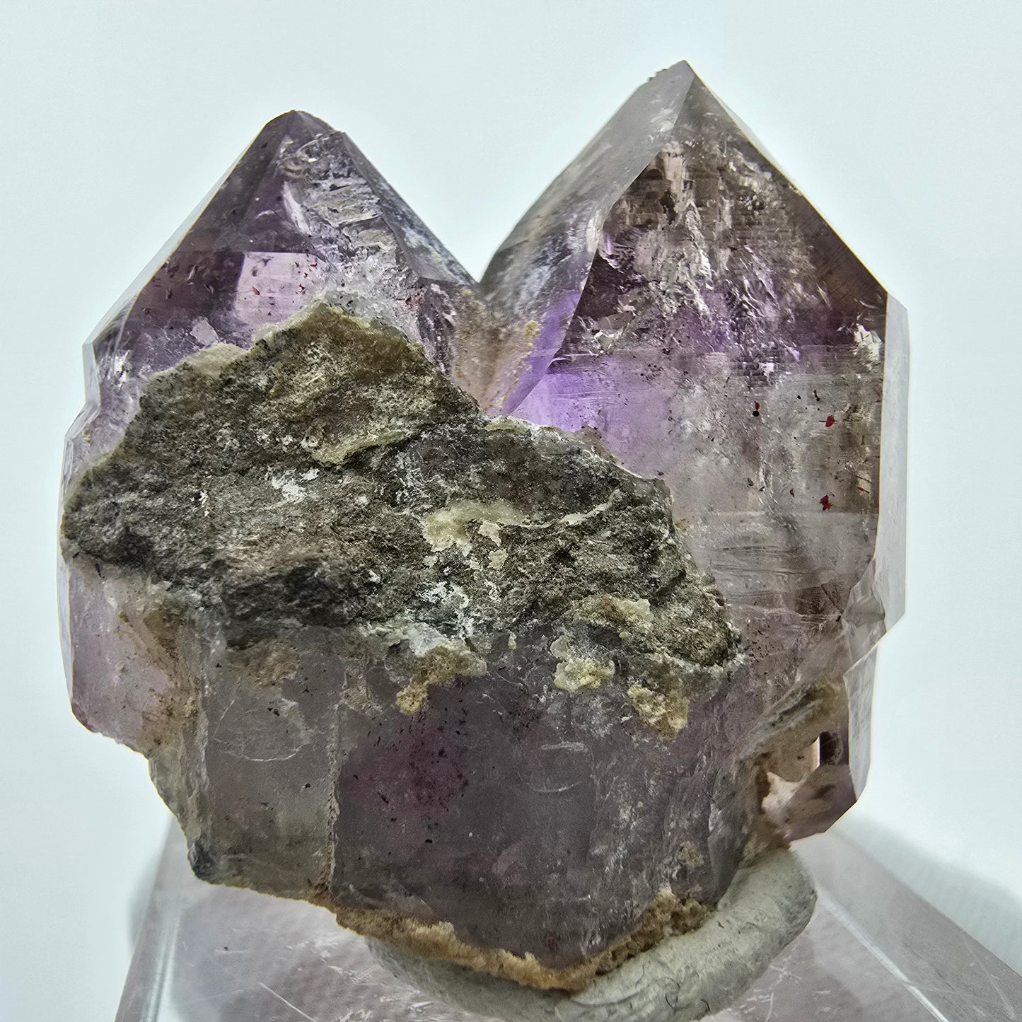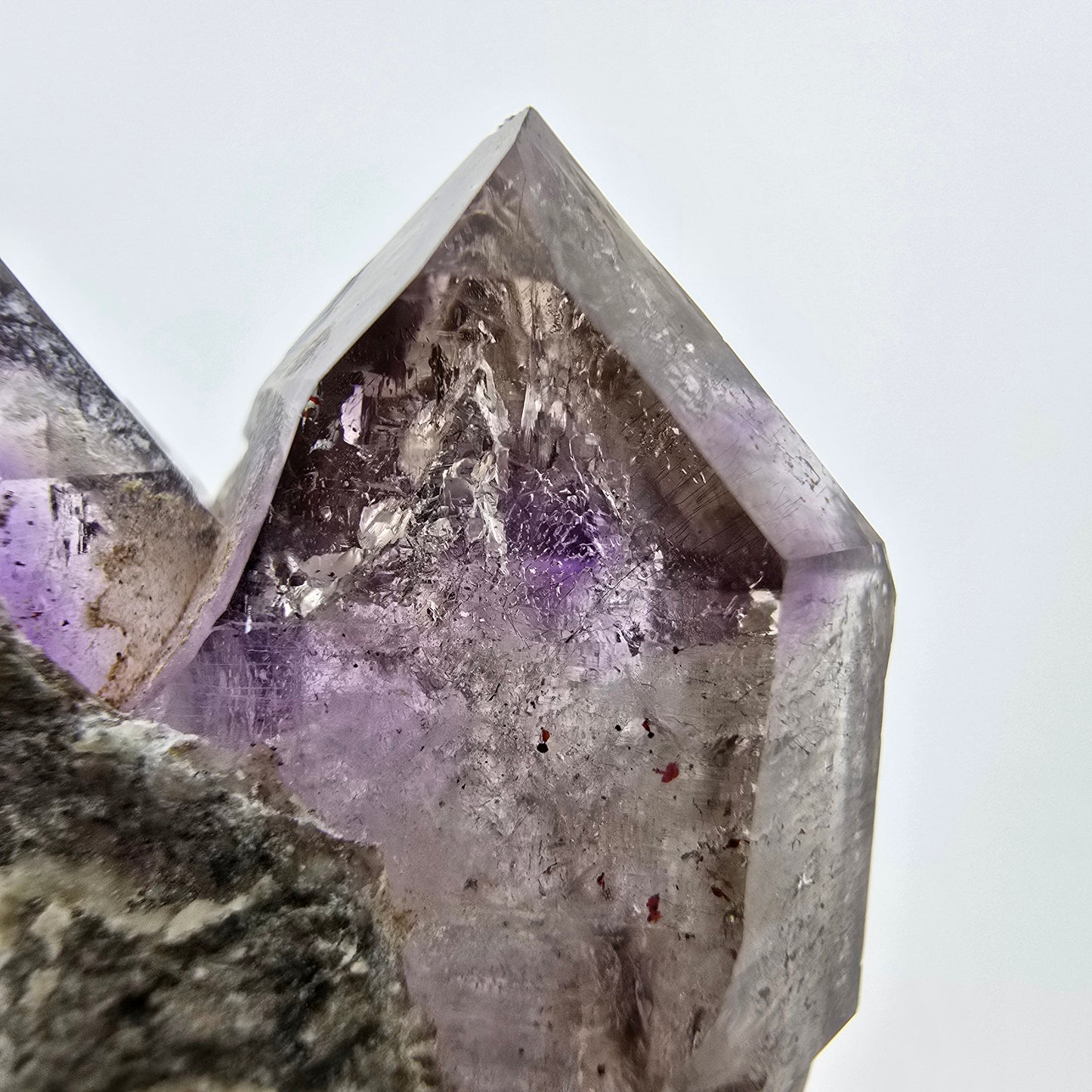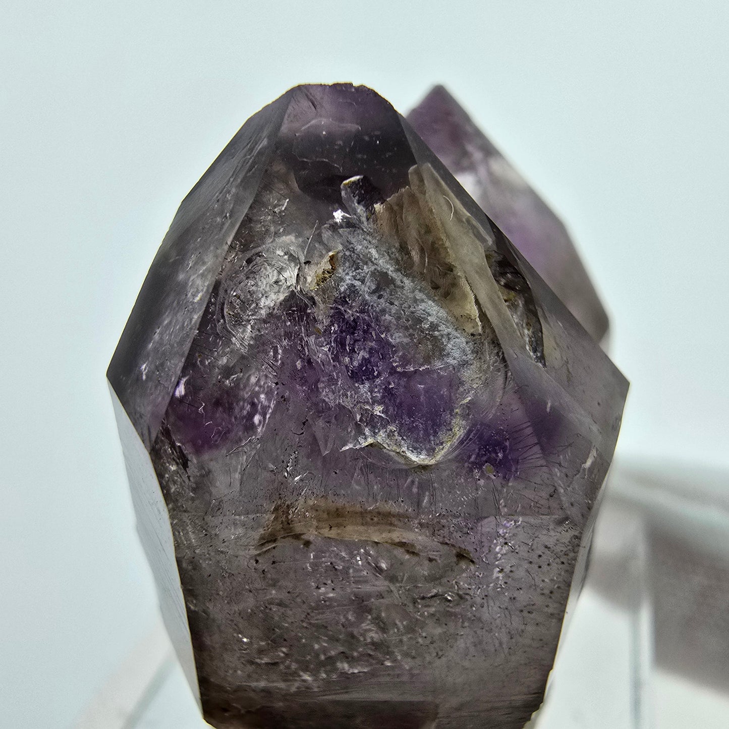 Die charakteristische Zepter-Kristallform und einige dekorative fensterförmige Einschlüsse machen diesen Amethyst nicht nur ästhetisch ansprechend, sondern auch zu einem einzigartigen Stück für Sammler und Liebhaber.