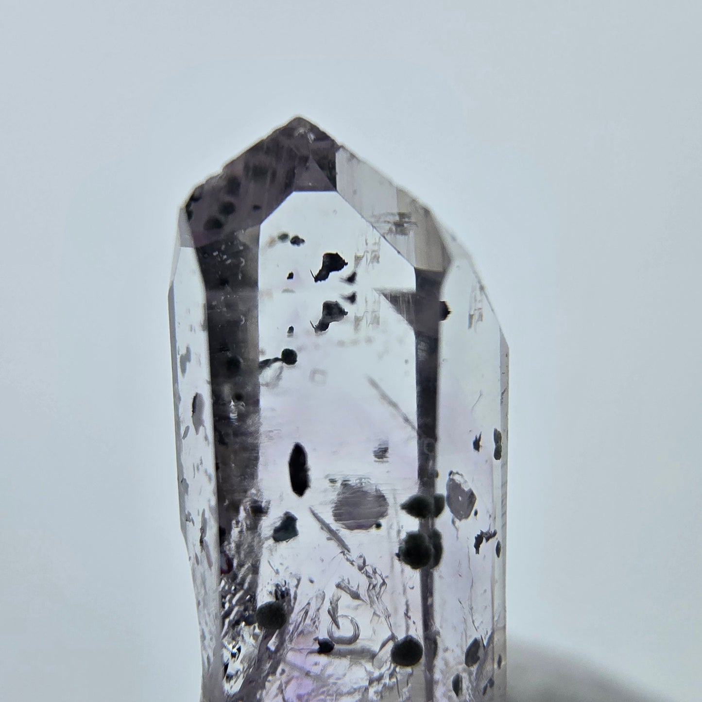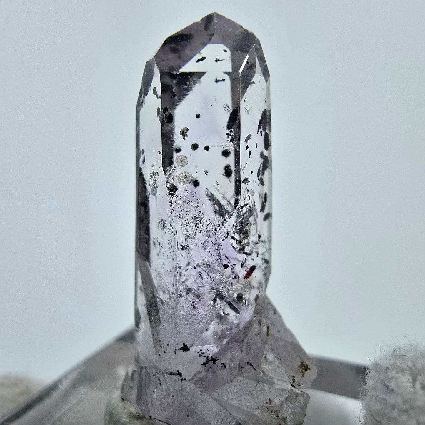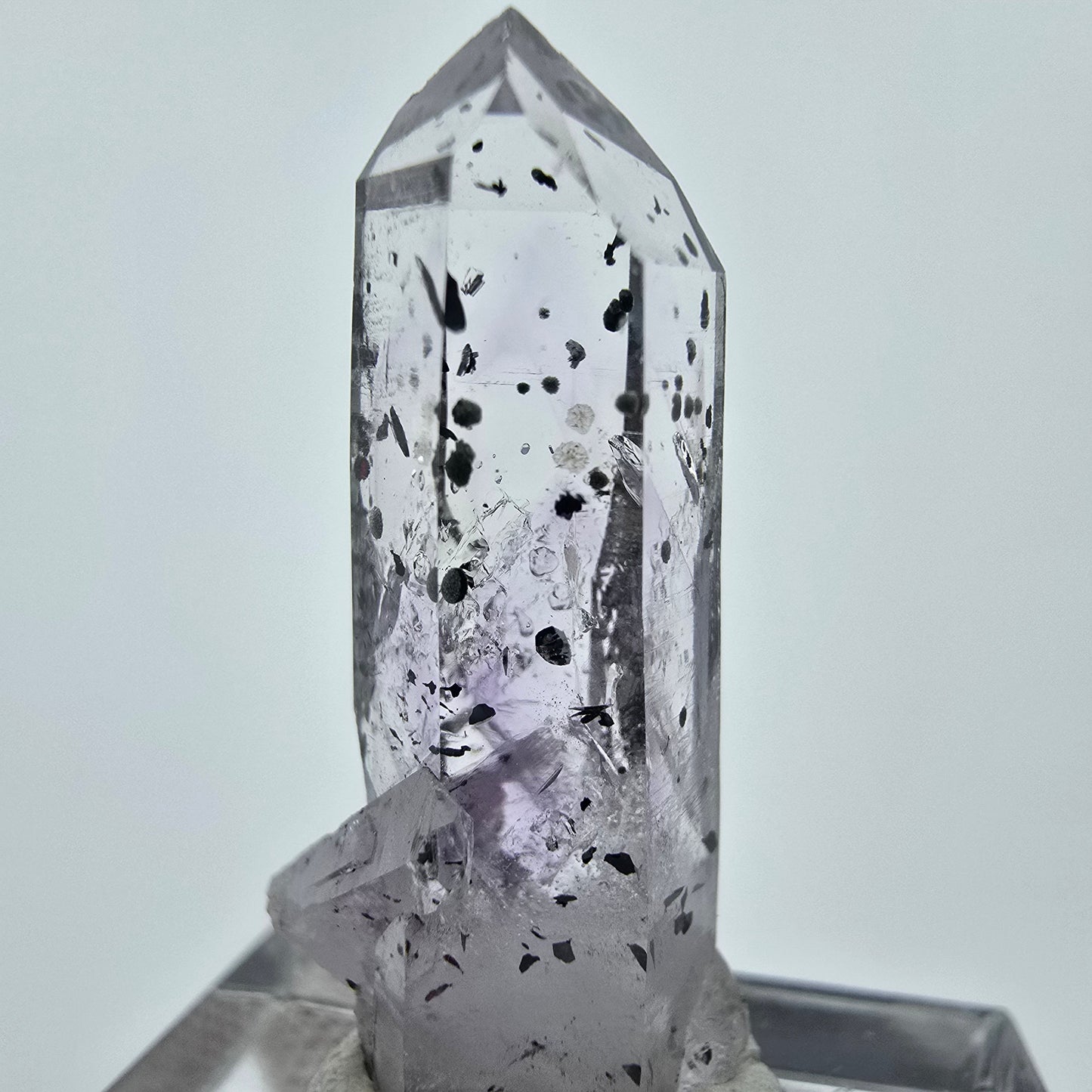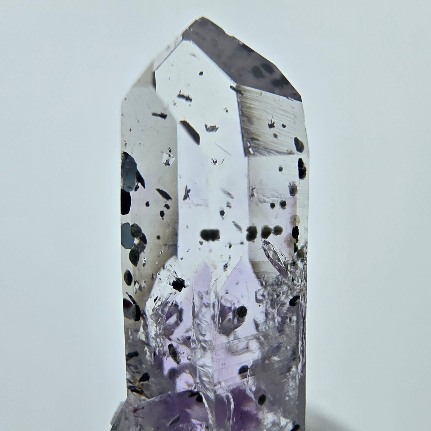 Entdecken Sie die faszinierende Schönheit des Phantom Amethyst Hämatit Quarzes. Dieser exquisite Kristall besticht durch seine wunderschöne lila und weiße Transparenz und zeigt beeindruckende Phantome im Inneren, die ihn zu einem wahren Kunstwerk der Natur machen. Die seltenen schwarzen Hämatit-Einschlüsse verleihen diesem Kristall eine besondere Tiefe und Charakter.