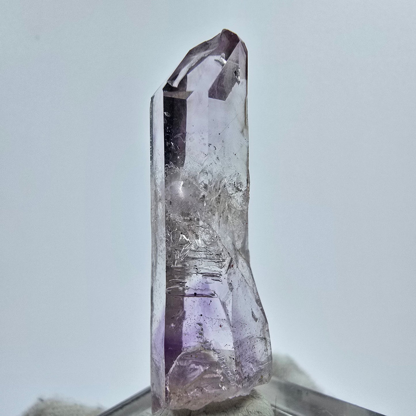 Entdecken Sie unseren beeindruckenden Phantom Amethyst Kristall, der mit wunderschönen Hämatit Kristallen verziert ist. Diese exquisite Kristallspitze zeigt eine zauberhafte lila-weiße Farbe und ist transparent. Das Besondere an diesem Kristall sind die faszinierenden Phantome im Inneren, typisch für Phantomquarz.