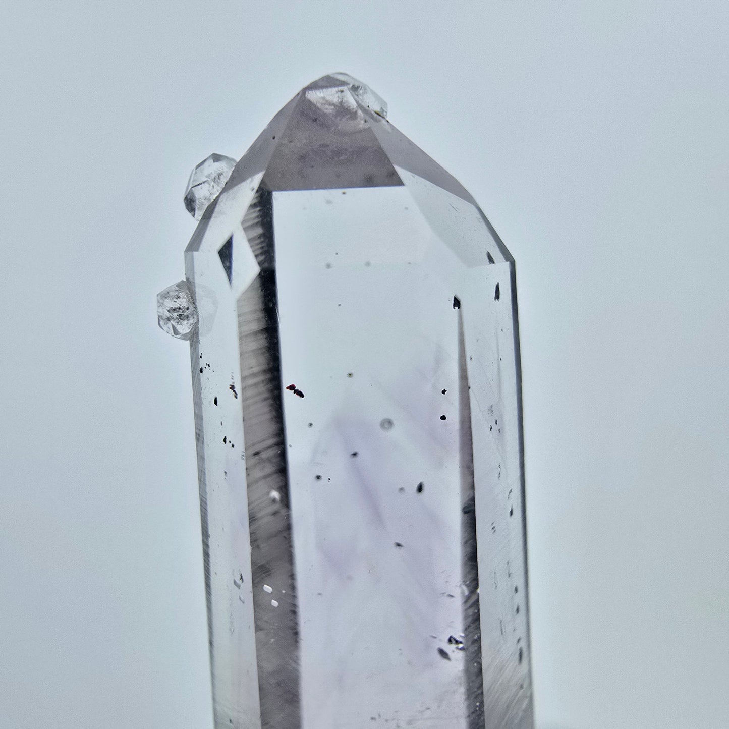 Entdecken Sie unsere exquisite Phantom Amethyst Kristallspitze mit einzigartigen Eigenschaften. Dieser wunderschöne lila-weiße und transparente Kristall weist atemberaubende Phantome in seinem Inneren auf, die im Fachjargon als Phantomquarz bekannt sind. Besonders auffällig sind die noppenförmigen Analcim-Kristalle, die an der Oberfläche gewachsen sind, sowie die schwarzen Hämatit-Kristalle, die im Kristall eingewachsen sind. Dieses eindrucksvolle Stück wurde in der Streep Mine in Goboboseb, Namibia, gefunden.