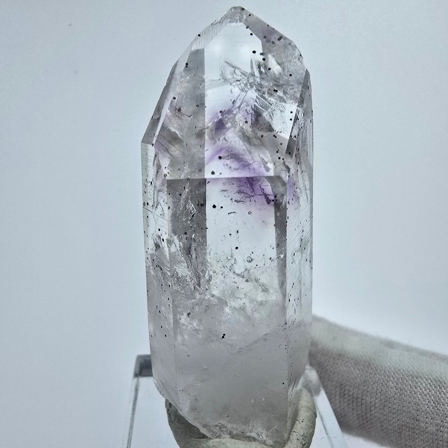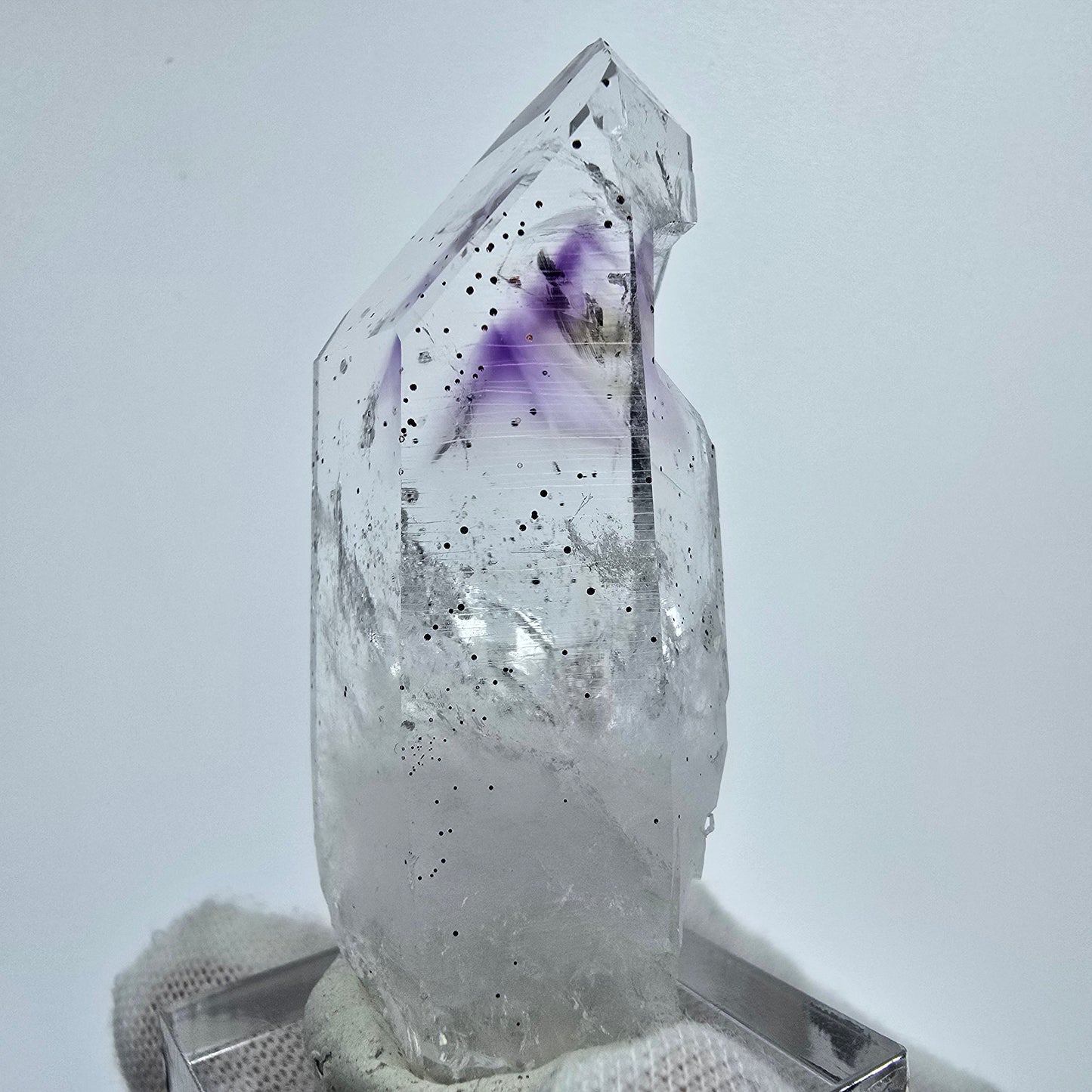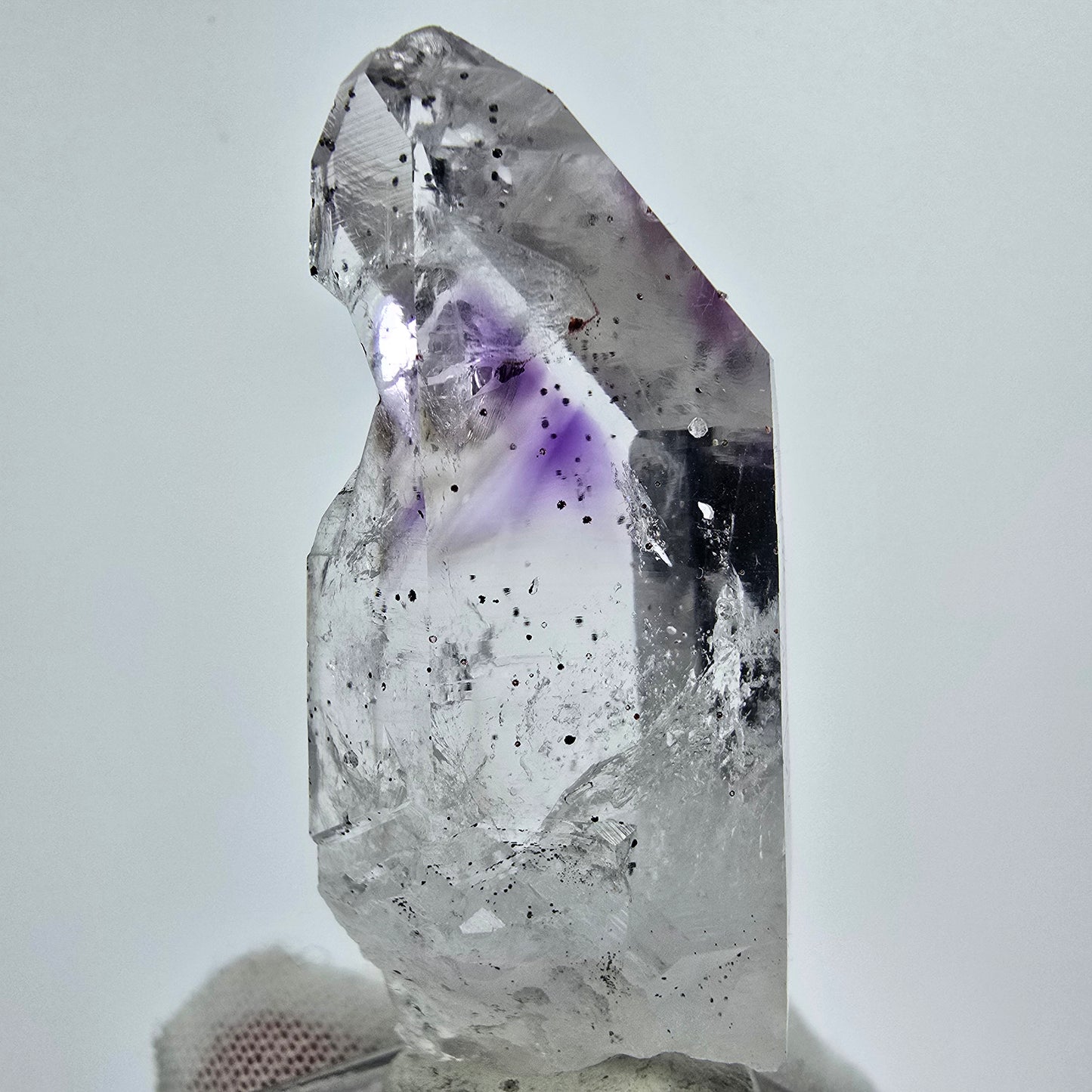 Entdecken Sie die Schönheit des Phantom Amethyst, präsentiert in einer atemberaubenden Kristallspitze, die mit faszinierenden Phantomen im Inneren (auch als Phantomquarz bekannt) verziert ist. Dieser exquisite Kristall weist eine schöne Kombination aus lila, weißer und transparenter Farbe auf und zieht mit seiner einzigartigen Erscheinung alle Blicke auf sich.