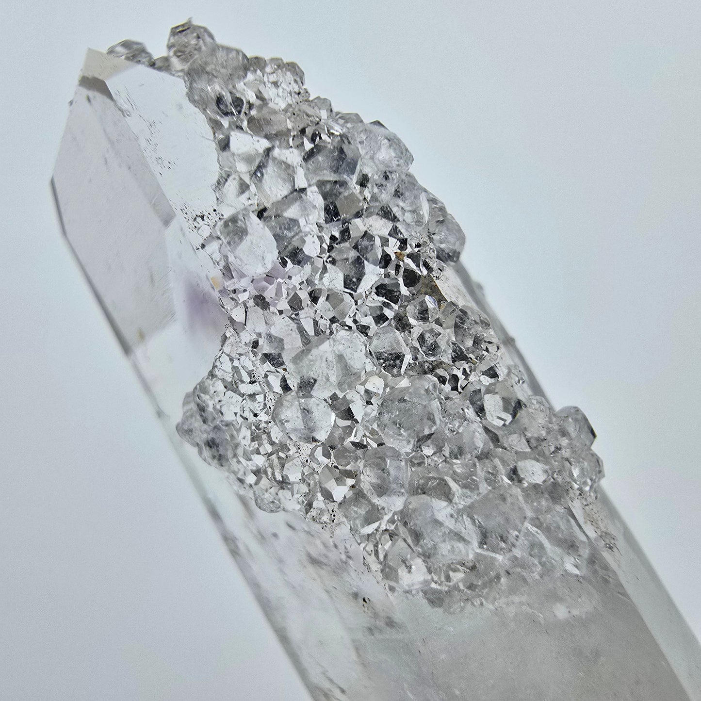 Entdecken Sie dieses exquisite, seltene Stück: ein klarer Amethyst mit einer faszinierenden lila-weiß-transparenten Kristallspitze. Die wunderschönen Phantome, die sich im Inneren des Kristalls befinden, machen dieses Exemplar zu etwas ganz Besonderem. An einer Seite sind zahlreiche weiß-transparente Analcim-Kristalle gewachsen, die dem Stück eine zusätzliche Dimension verleihen.