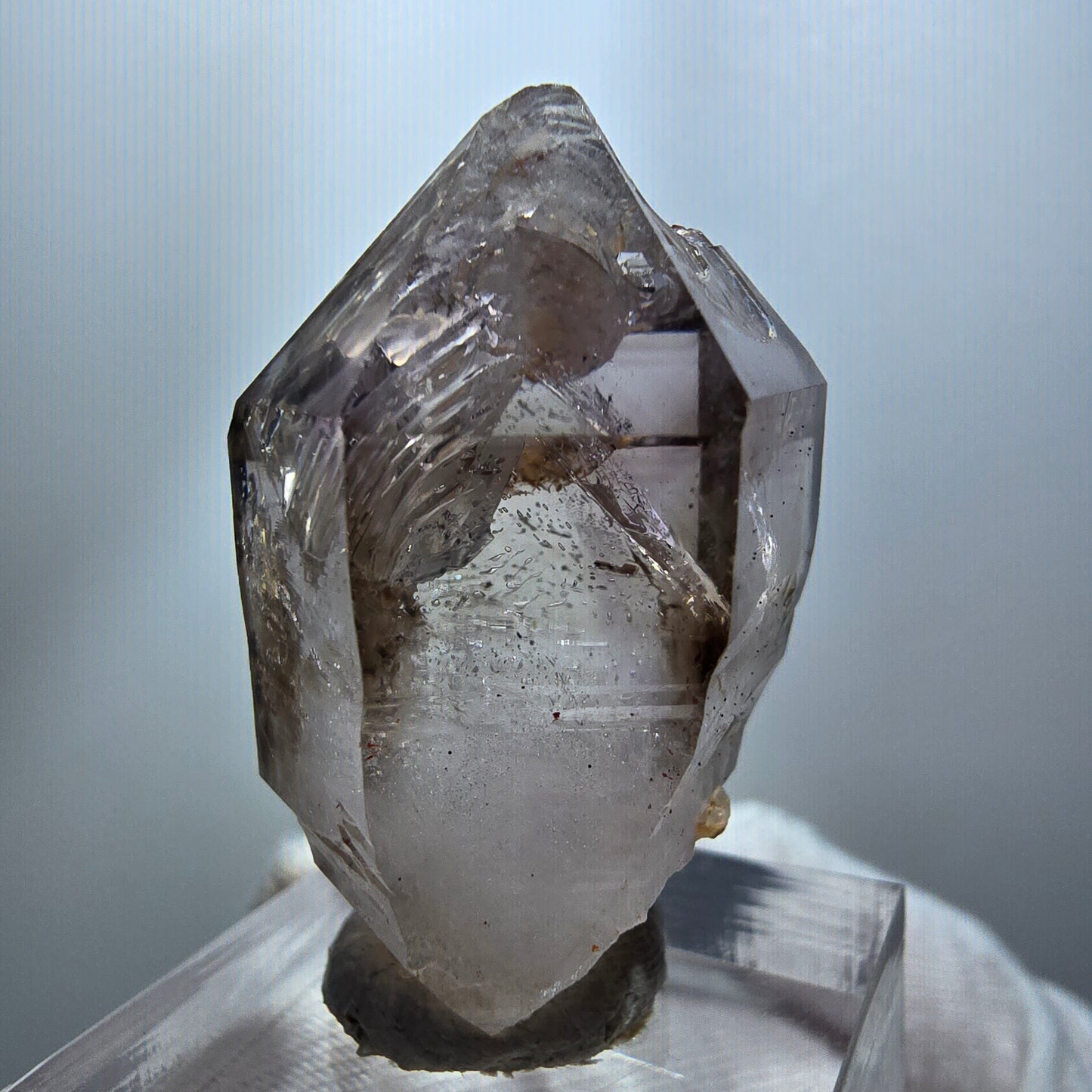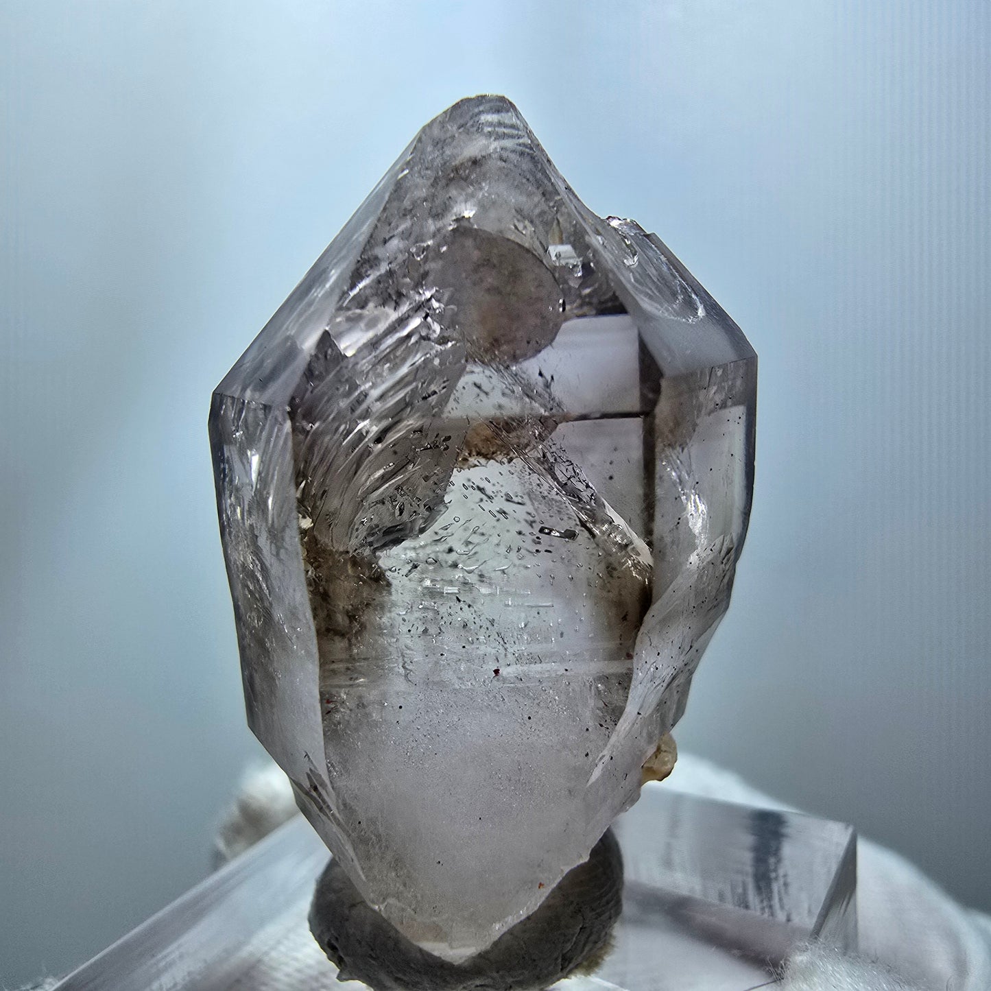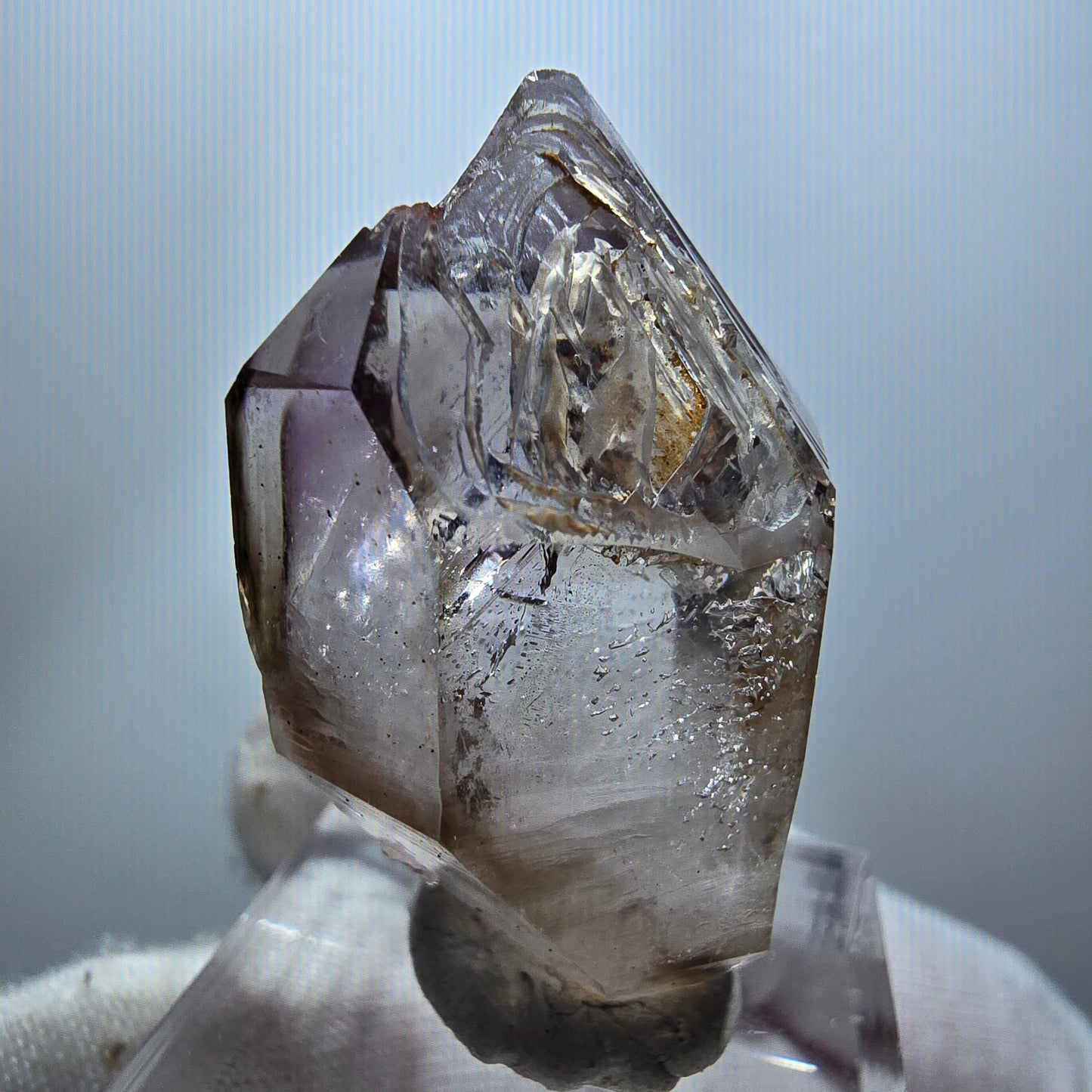 Entdecken Sie die Schönheit des seltenen Phantom Amethyst Rauchquarz Fenster Zepters. Dieses einzigartige Stück beeindruckt durch seine lila-braun-weiße transparente Kristallbildung und die zauberhaften Phantome, die sich im Inneren des Kristalls verbergen. Mit seiner markanten Zepter-Kristallform, die typischen für Zepter Quarz ist, und fensterförmigen Einschlüssen (Fensterquarz), bietet dieser Kristall nicht nur ästhetischen Reiz, sondern auch eine spannende Besonderheit.