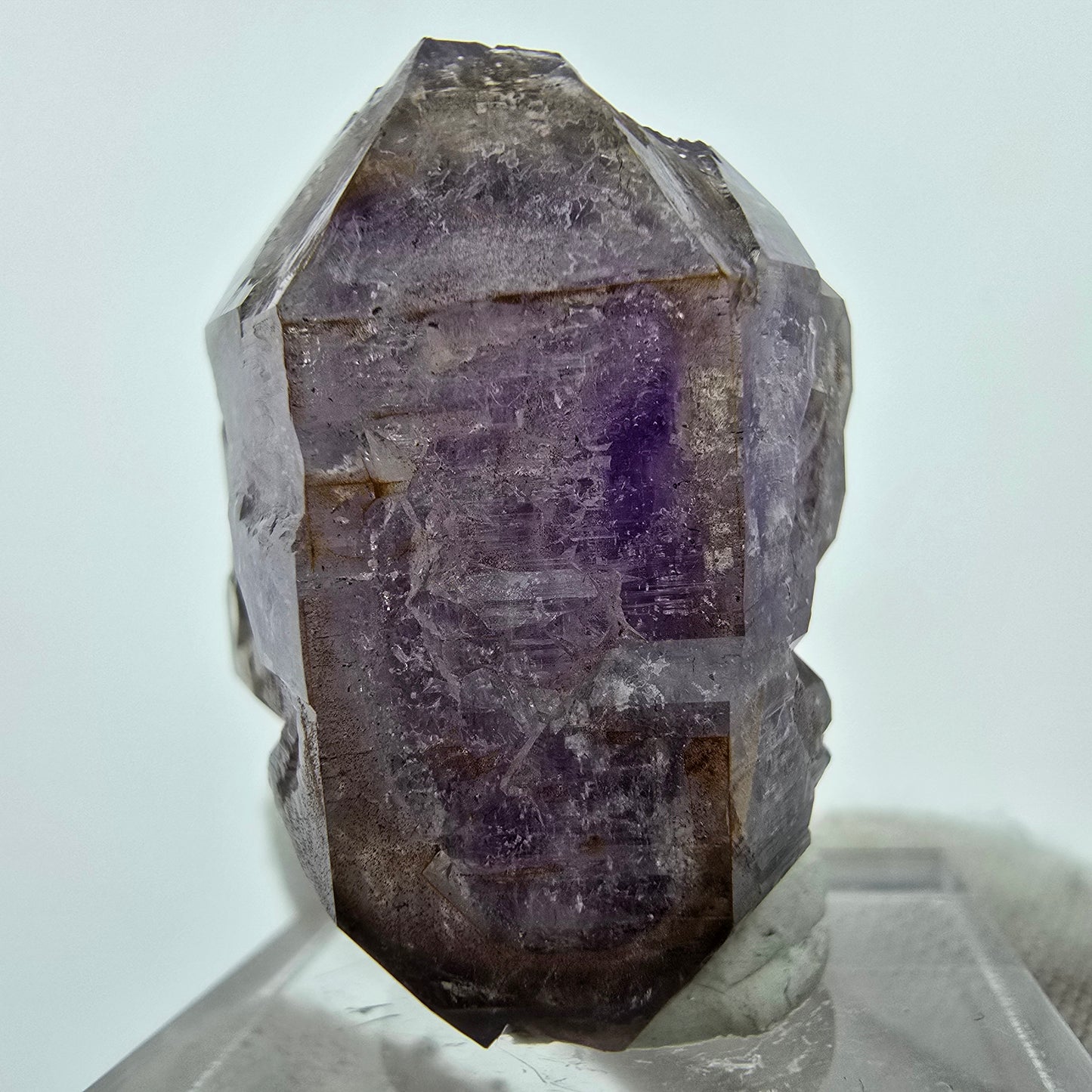 Entdecken Sie die faszinierende Schönheit des Phantom Amethyst Skelett DT Zepter Kristalls. Dieser exquisite Kristall besticht durch seine atemberaubende lila-braun-weiße Transparenz und die einzigartigen Phantome, die im Inneren des Kristalls sichtbar sind. Der Phantom Amethyst ist ein doppelender Kristall (DT Zepter Quarz), der durch seine zepterförmige Doppelender Kristallform besticht.