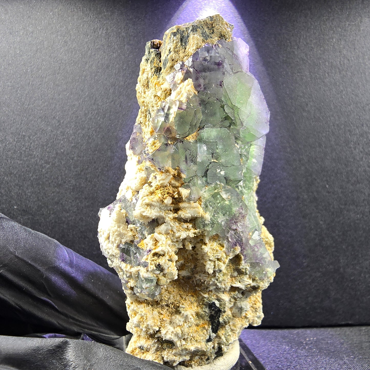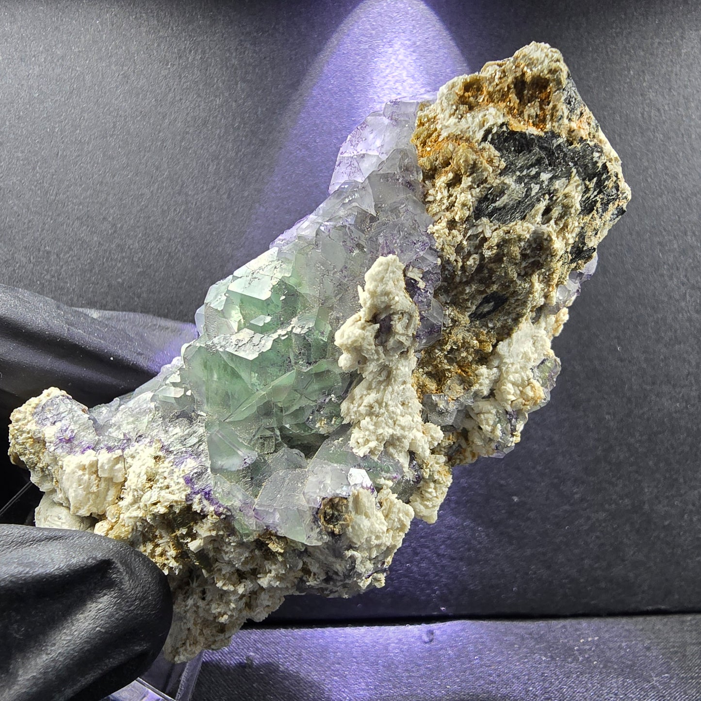 Diese seltene Mineralienstufe besticht durch ihre faszinierende Kombination verschiedener Mineralien. Im Zentrum steht eine phantomartige Fluorit-Kristallbildung in transparenten grün-lila Tönen. Bei genauerer Betrachtung offenbaren sich im Inneren der Kristalle wunderschöne Phantome, die dieser Stufe ihren besonderen Reiz verleihen.