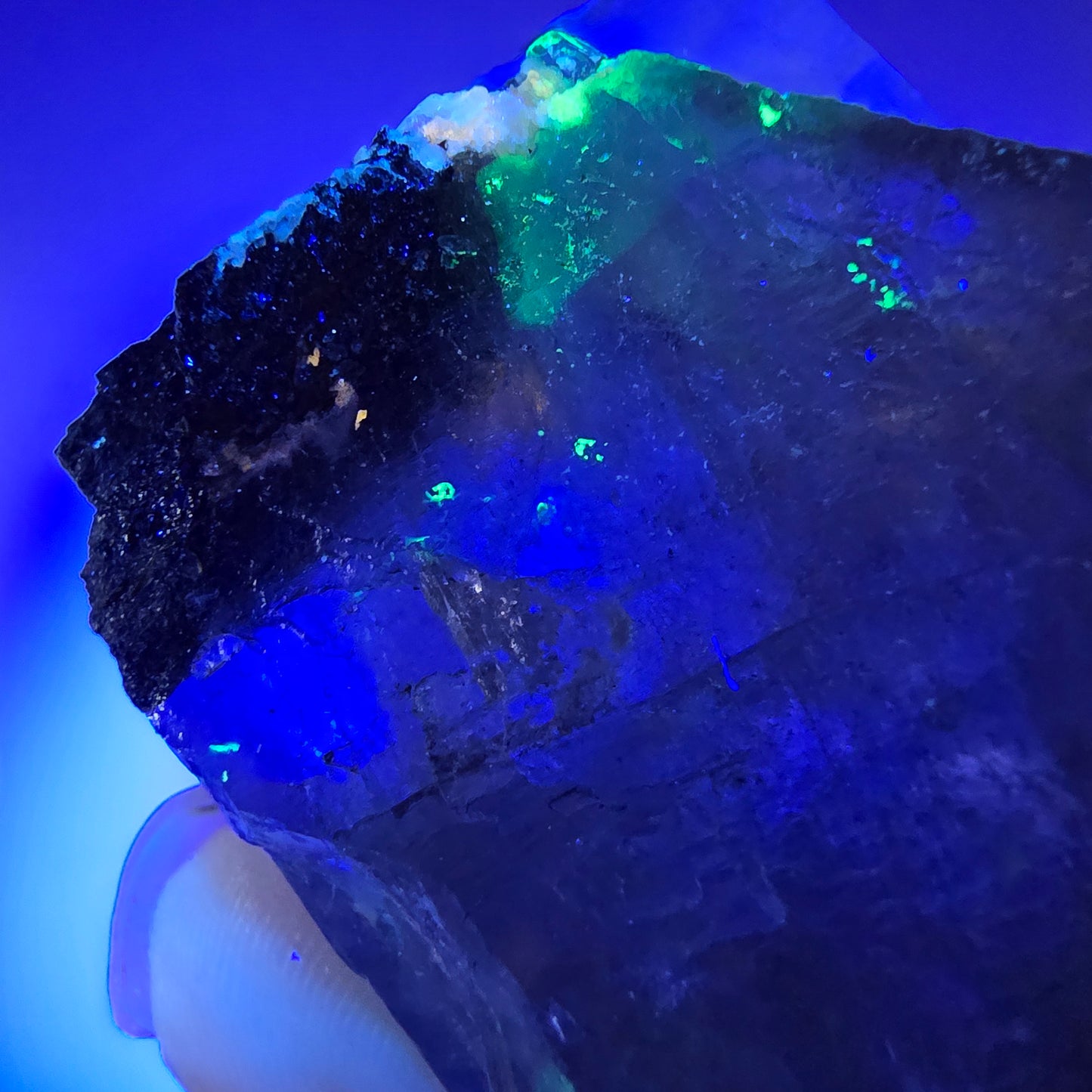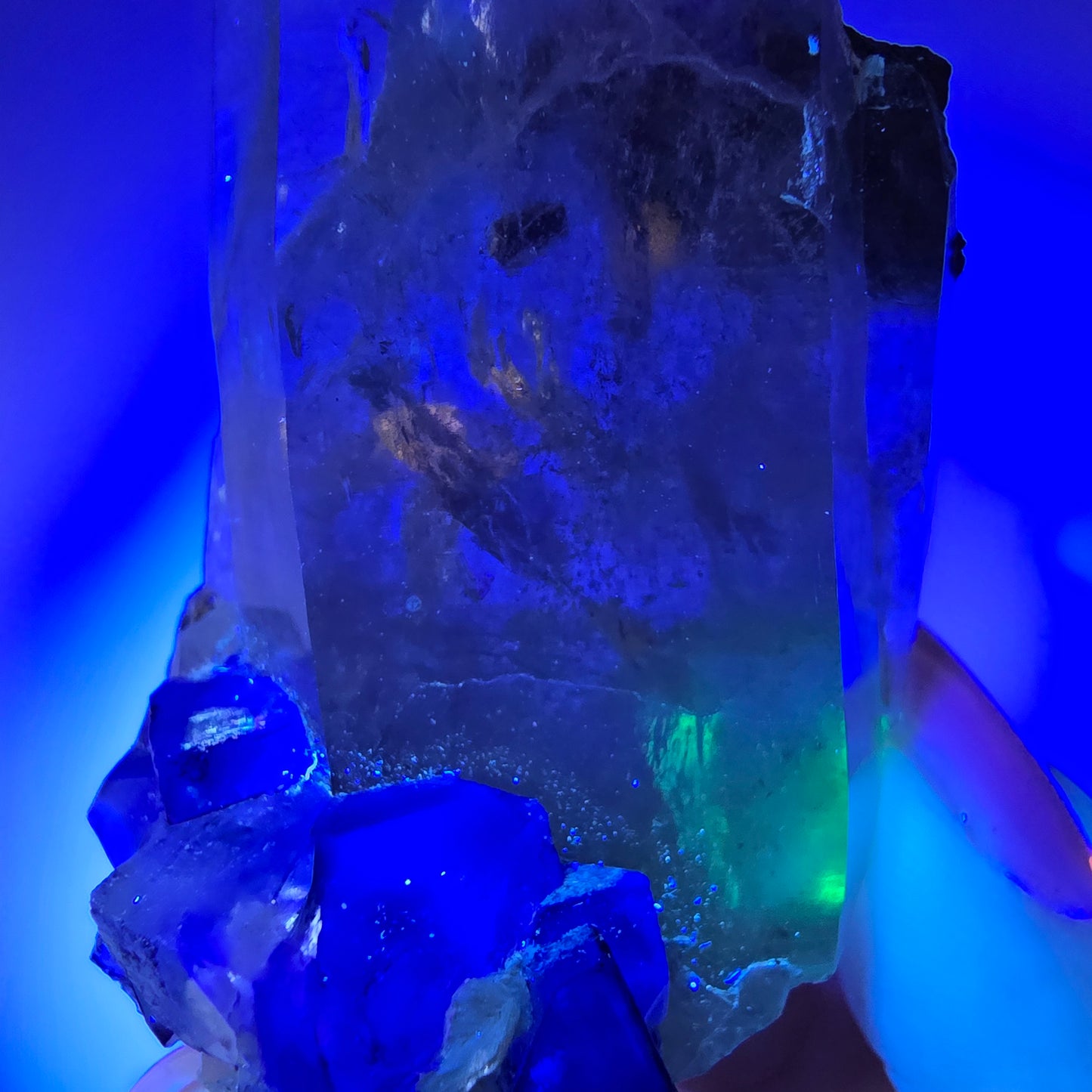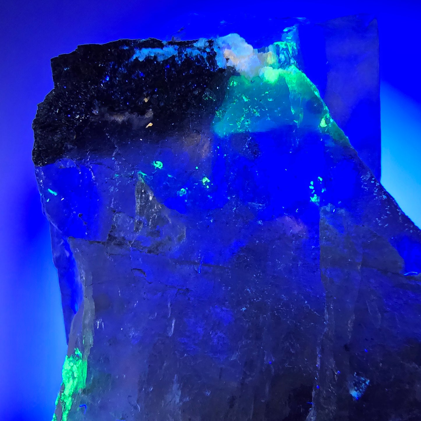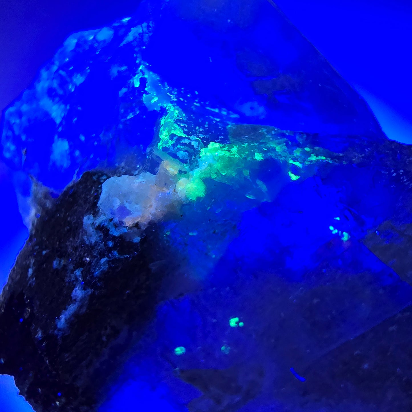 Zusätzlich sind auf der Stufe auffällige schwarze Schörl Turmalin Kristalle sowie gelbe Muskovit Kristalle und Hyalit Kristalle zu finden. Letztere besitzen einen besonderen Reiz, denn sie leuchten unter UV-Licht in einem intensiven Neongelb und setzen so einen eindrucksvollen Akzent.