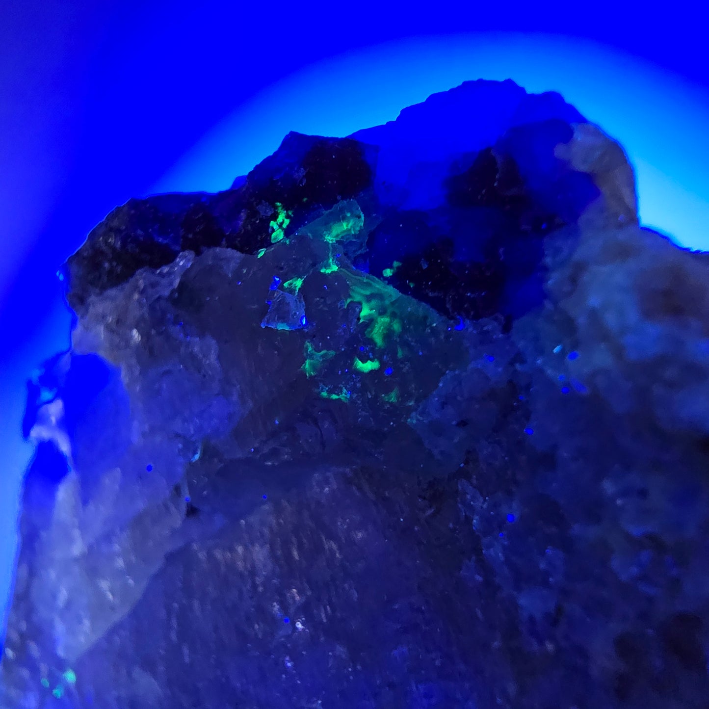- Hyalit Kristalle leuchten neongelb unter UV-Licht