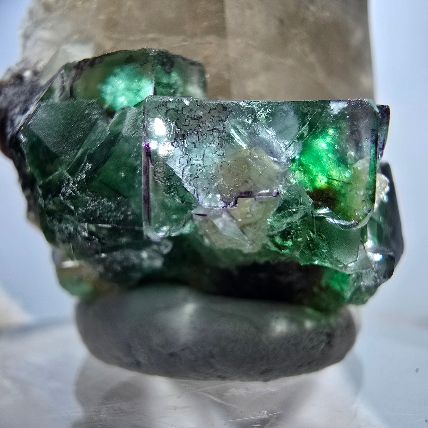 Entdecken Sie diese atemberaubende und seltene Mineralienstufe aus Erongo, Namibia. Diese einzigartige Stufe trägt transparente, grün-braun gefärbte Phantom Fluorit Würfel, in denen wunderschöne Phantome sichtbar sind. Diese faszinierenden Kristalle sind auf einer braun-transparenten Rauchquarz Kristallspitze gewachsen und verleihen dem Gesamtbild einen herausragenden Charakter.
