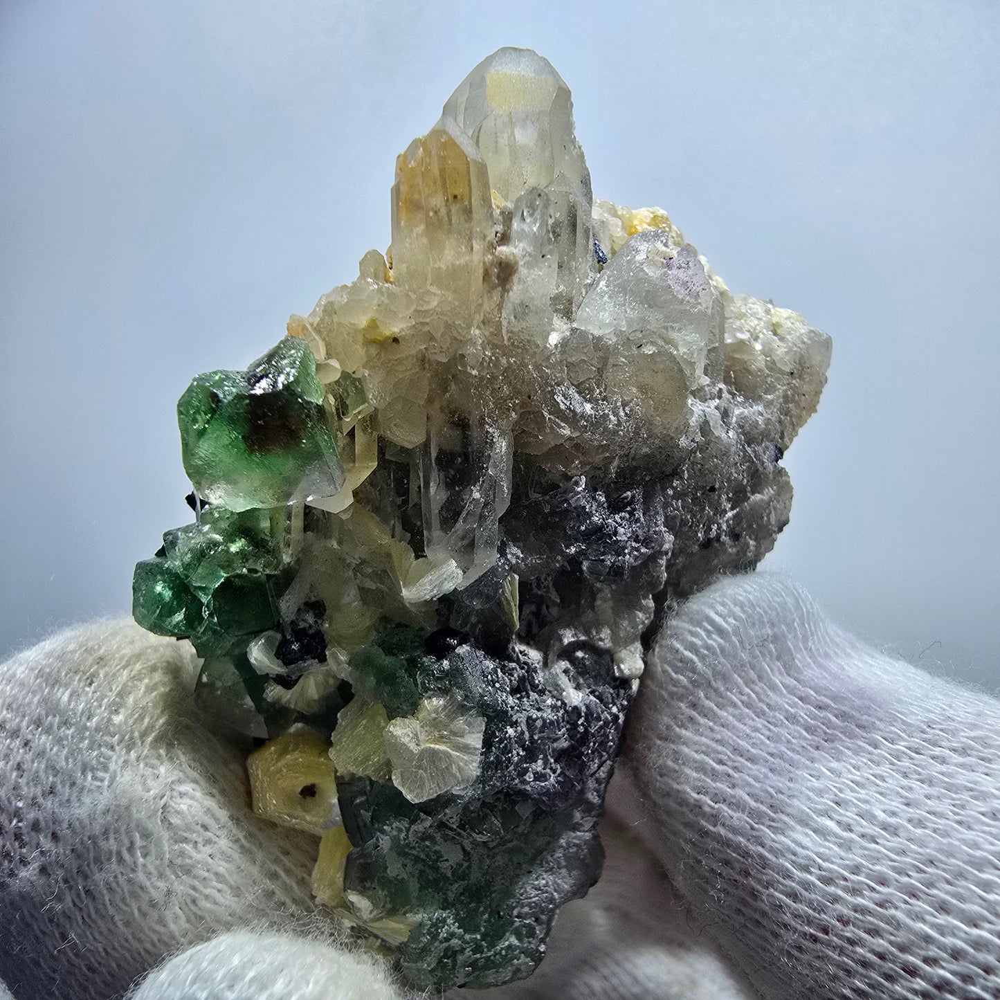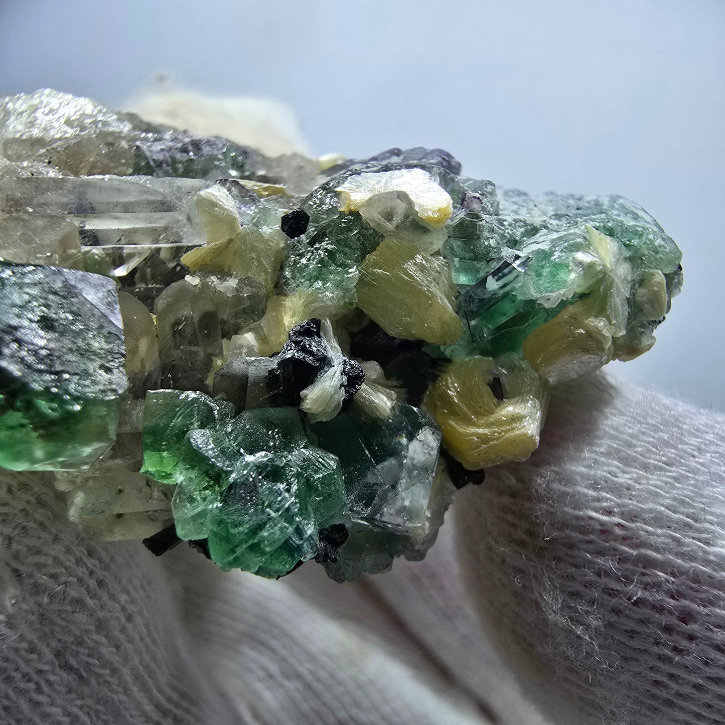 Entdecken Sie diese faszinierende Mineralienstufe, die eine einzigartige Kombination aus grün-braun-transparenten, klaren Phantom Fluorit Würfeln bietet. In diesen exquisite Kristallen sind wunderschöne Phantome zu erkennen, die dem Stück eine zauberhafte Ausstrahlung verleihen. Ergänzt wird die Stufe von gelb metallisch glänzenden Muskovit Kristallen, weiß-braun-transparenten Rauchquarz Kristallspitzen und länglichen, schwarzen Schörl Turmalin Kristallen, die dem Gesamterscheinungsbild weiteren Charakter verleihen.