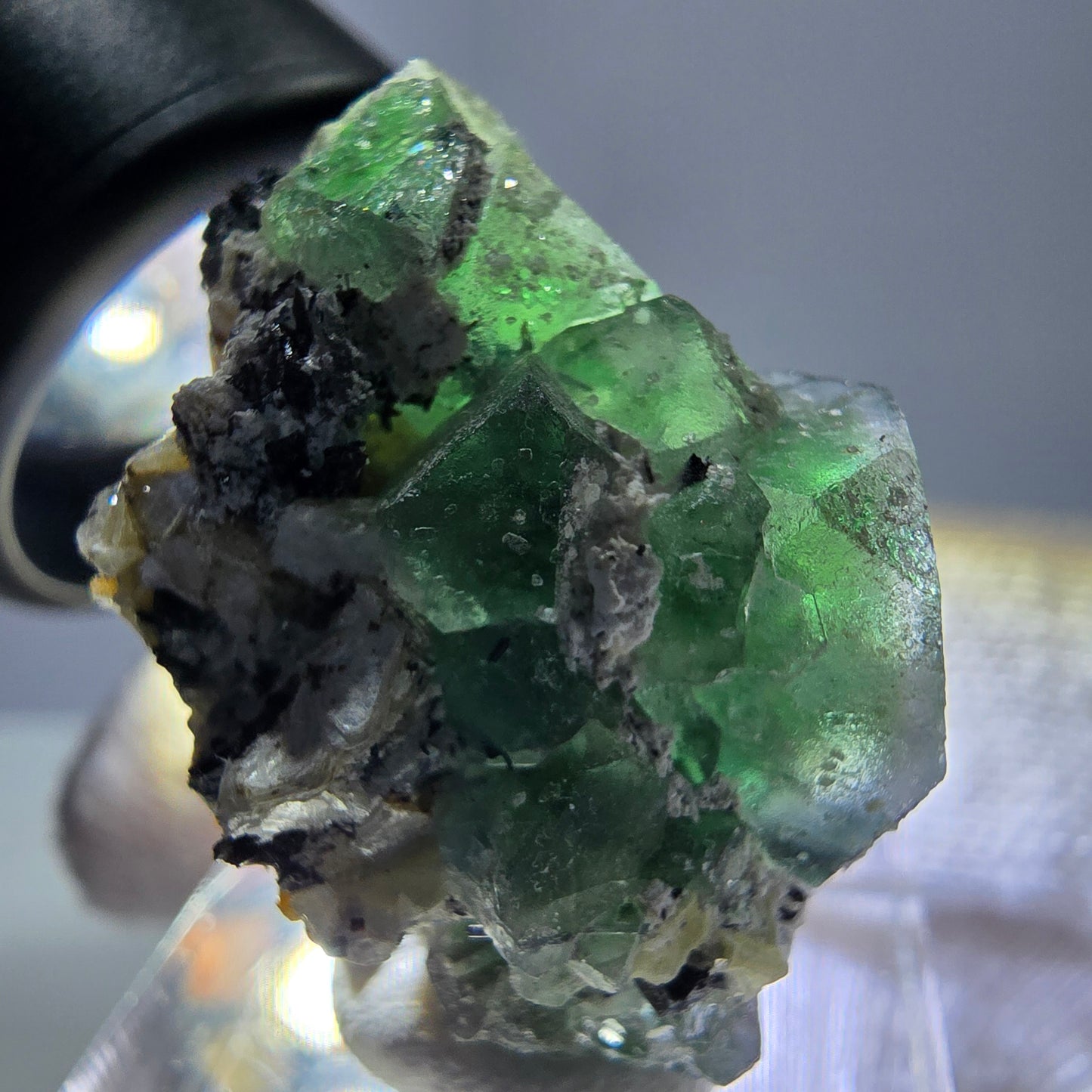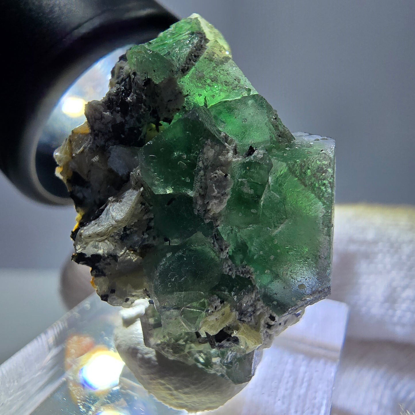 Entdecken Sie diese faszinierende seltene Mineralienstufe, die aus exquisiten grünen und weißen, transparenten sowie klaren Phantom Fluorit Würfeln besteht. Im Inneren der Kristalle sind wunderschöne Phantome zu erkennen, die dem Stück eine mysteriöse Tiefe verleihen. Die Stufe ist zusätzlich mit schwarz glänzenden Schörl Turmalin Kristallen und gelb glänzenden Muskovit Kristallen verziert, was zu einem beeindruckenden Gesamtbild führt.