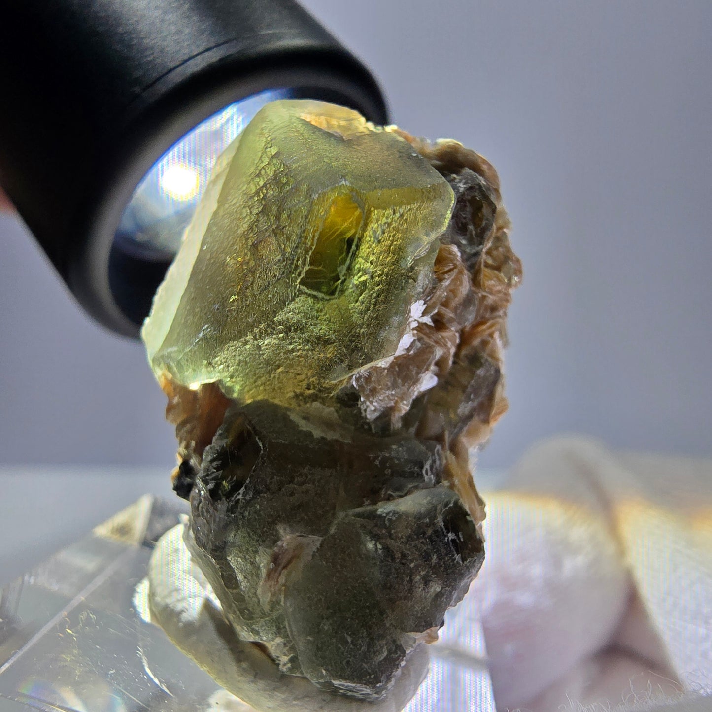 Entdecken Sie diese seltene Mineralienstufe, die aus atemberaubenden, grün-braun transparenten und klaren Phantom Fluorit Würfeln besteht. Diese kristallisierten Würfel besitzen eine kubische sowie teils hexagonale Form und offenbaren im Inneren wunderschöne Phantomstrukturen.